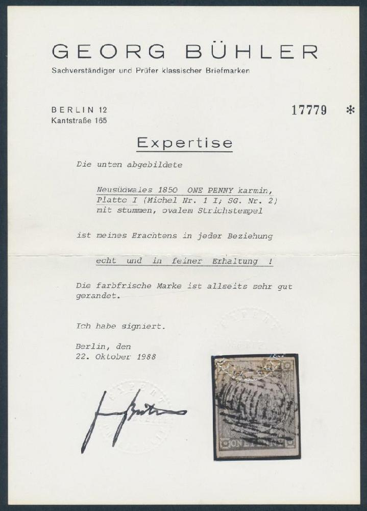 | Zusatzinformationen und Suchstichworte: | 248. Abacus Auktion Auktionstermin: 20. - 22. Juli 2022 Los 486 Neusuedwales 1850-51 Sydney schaut Platte I (keine Wolken) 1d karmin SG 2, voll- bis breitrandig mit ein Fragment des angrenzend Einheit an der Unterseite, Barren Stempel von Sydney, Katalogwert £550. Georg Bühler Attest (1988) Ausruf 270,00 AUD |