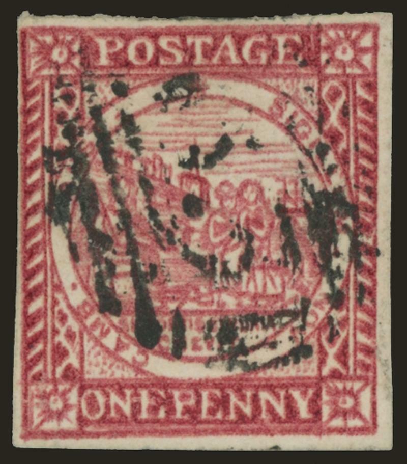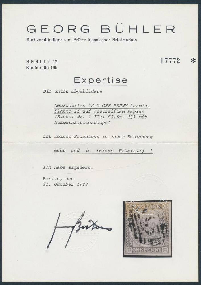 | Zusatzinformationen und Suchstichworte: | 248. Abacus Auktion Auktionstermin: 20. - 22. Juli 2022 Los 492 Neusuedwales 1850-51 Sydney schaut Platte II (Wolken) auf waagrecht gestreiftem Papier 1d tiefkarmin SG 13, gerandet dicht bei gut, derangiert aber hell BN Stempel, Katalogwert £750. Pracht! Georg Bühler Attest (1988) Ausruf 380,00 AUD |