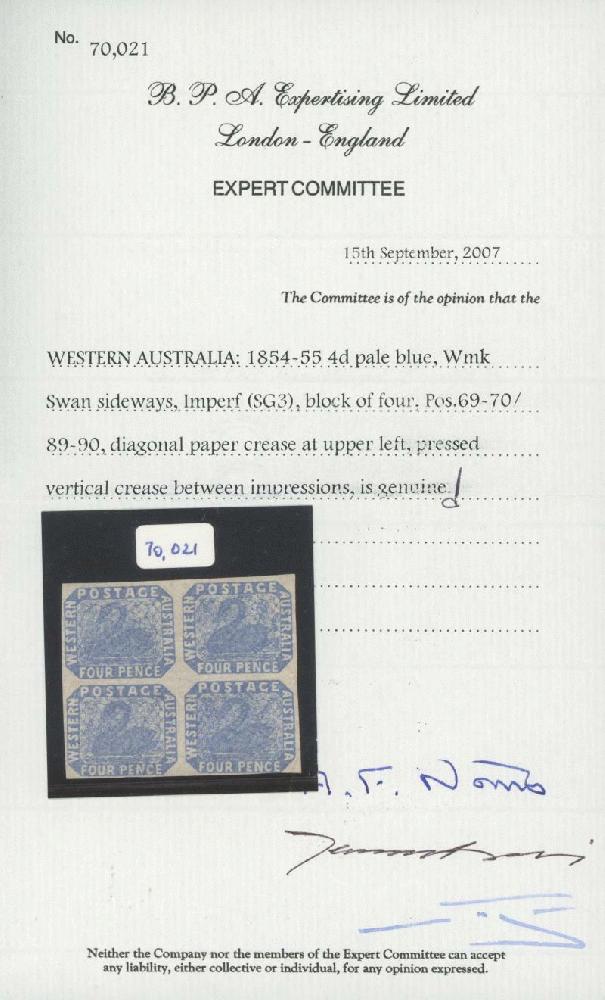 | Zusatzinformationen und Suchstichworte: | 248. Abacus Auktion Auktionstermin: 20. - 22. Juli 2022 Los 745 Westaustralien 1854-55 Lithographien ungezähnt 4d fahlblau SG 3 Viererblock (69-70/89-90), gerandet dicht bei große, die erste Einheit mit Spieß in Schwäne Brust, ausgebügelt senkrechte Falte zwischen die Einheiten in keiner Weise entzieht vom Pracht Gesichts- scheinend, ungebraucht, Katalogwert £1500 + + . Ex Lord Vestey: verkaufte in 2015 für £2160. BPA Attest (2007) frustrierend hinweist zu "diagonal Papierbug zu oben links", welches ist unmerkliche Ausruf 2.500,00 AUD |