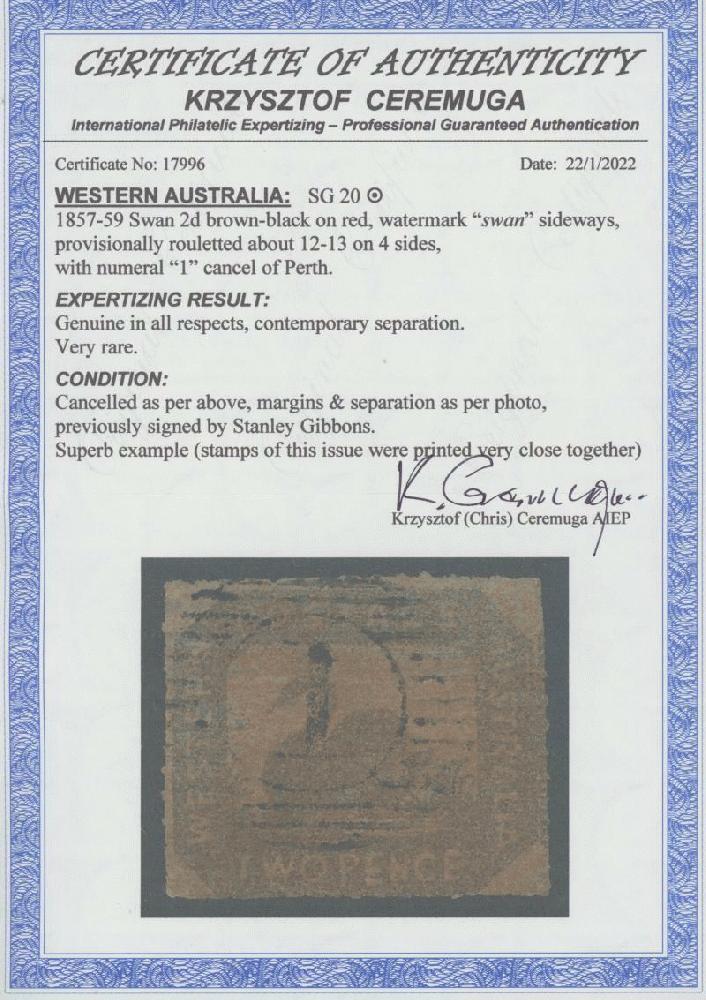 | Zusatzinformationen und Suchstichworte: | 248. Abacus Auktion Auktionstermin: 20. - 22. Juli 2022 Los 754 Westaustralien 1857-59 Hillman Lithographien durchstochen 12-13 2d braunschwarzer/rot SG 20 vom Grundstock des Bogens mit waagrecht Randwasserzeichen Linien, Durchstich allseits und klare des Designs außer an der Unterseite wohin die Zeichnung ist gerade berührt, außergewöhnlich Zentrierung, 15-bar 1 Stempel von Perth, Katalogwert £2000. Pracht! Chris Ceremuga Attest (2022) Bundesländer "echt in jeder Hinsicht ...very selten ...superb Beispiel ... " Ausruf 1.150,00 AUD |