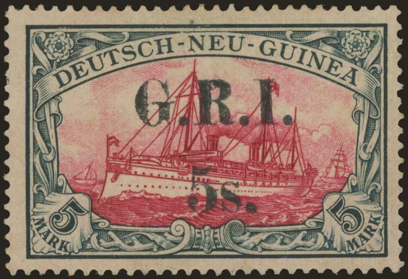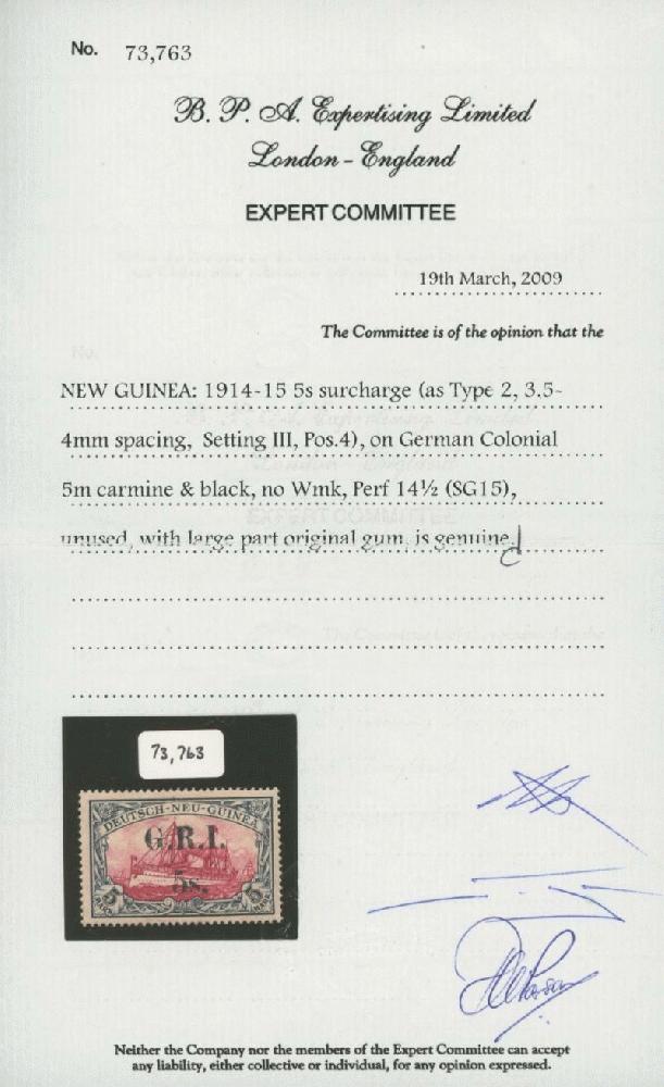 | Zusatzinformationen und Suchstichworte: | 248. Abacus Auktion Auktionstermin: 20. - 22. Juli 2022 Los 1399 Neuguinea1914-15 hohe Werte mit 3½-4mm Abstand 5 s. auf 5mk karmin & blauschwarz SG 15 (Stg 3, Position 4), gut zentriert, geradezu fein aber etwas gealtert, Großteil Originalgummi mit zwei Garantiesignaturen, Katalogwert £15,000. eine seltene Marke. BPA Attest (2009) Ausruf 10.500,00 AUD |