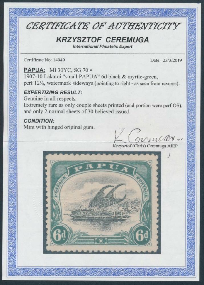 | Zusatzinformationen und Suchstichworte: | 248. Abacus Auktion Auktionstermin: 20. - 22. Juli 2022 Los 1457 Papua 1907-10 Lithographien Wasserzeichen liegend gezähnt 12½ 6d schwarz & myrthengrün SG 70, gut zentriert, leichter Bug jenes doesnt beeinflussen die außergewöhnlich Gesichts- scheinend, Katalogwert £5500. eine seltene Marke. Chris Ceremuga Attest (2019) Ausruf 3.000,00 AUD |