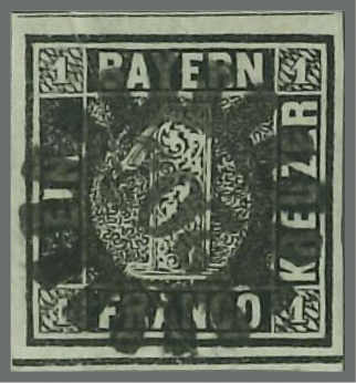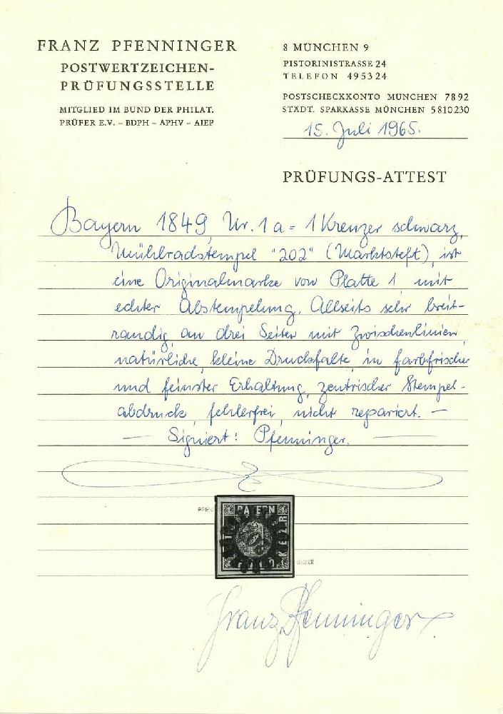 | Zusatzinformationen und Suchstichworte: | Rapp Auktion 2022 Auktionstermin: 2. - 7. Mai 2022 Los 926 Altdeutschland Bayern 1 Kr. schwarz, Platte 1, frisch und tadellos vom unteren Bogenrand stammend mit 3 Schnittlinien und Mühlradstempel "202". Die kleine vorhandene Papierfalte ist ursprünglich und wurde überdruckt. Laut Attest Sem sind diese auf der 1 Kr. schwarz selten, da solche Bogen als Makulatur aussortiert wurden. Zusätzliches Attest Pfenninger. Zuschlag 1.600,00 CHF |