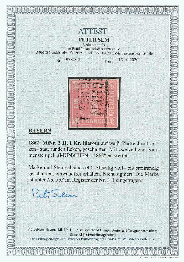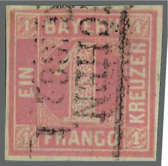 | Zusatzinformationen und Suchstichworte: | Rapp Auktion 2022 Auktionstermin: 2. - 7. Mai 2022 Los 927 Altdeutschland Bayern 1 Kr. lilarosa, Platte 2 mit spitzen statt runden Ecken, frisch und sauber mit Rahmenstempel von München, einwandfrei erhalten. Attest Sem. Zuschlag 850,00 CHF |