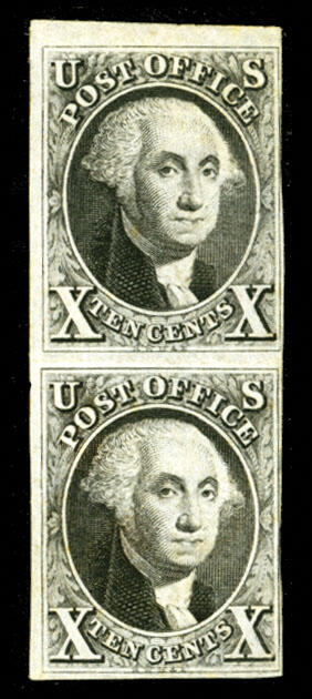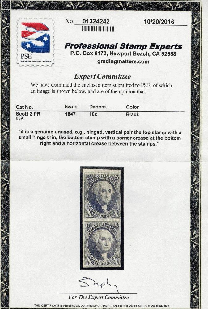 | Zusatzinformationen und Suchstichworte: | Cherrystone - Worldwide Stamps and Covers Auktionstermin: 12. - 14. Juli 2022 Los 7 USA 1847 Ausgabe 1847 10c black, vertical pair, unused with original gum, h.r., large margins at top and left, full at bottom and just clear at right, folded between stamps, top stamp with small hinge thin, bottom stamp with corner crease, otherwise a fine multiple, with 2016 PSE certificate. A rarity, only a handful of pairs with original gum exist, (Catalog value $90,000) Zuschlag 14.000,00 USD |