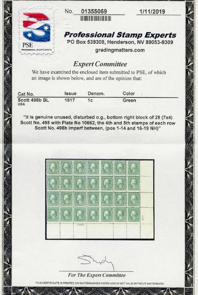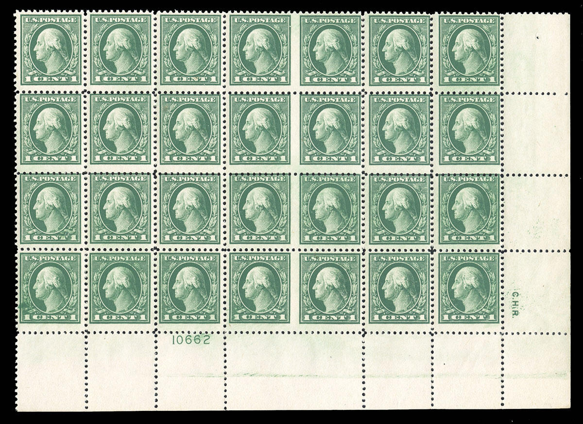 | Zusatzinformationen und Suchstichworte: | Cherrystone - Worldwide Stamps and Covers Auktionstermin: 12. - 14. Juli 2022 Los 118 USA 1922-29 Ausgabe1917 1c green, corner margin plate number block of 28, imperf. vertically between the fourth and fifth column resulting in four horizontal pairs imperf. between, three of the pairs n.h., one pair and most of the sheet with disturbed original gum, fine and scarce multiple, especially rare with plate number, with 2019 PSE certificate (catalogue value for four pairs) (Catalog value $4,650) Zuschlag 2.400,00 USD |
