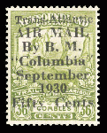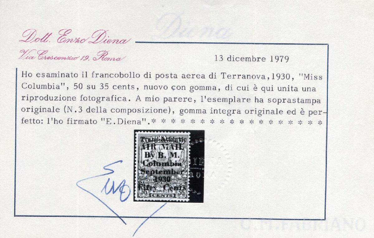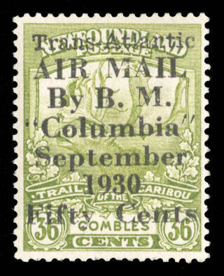 | Zusatzinformationen und Suchstichworte: | Cherrystone - Worldwide Stamps and Covers Auktionstermin: 12. - 14. Juli 2022 Los 711 Neufundland 1930 50c on 36c olive green, "Miss Columbia", n.h., well centered, signed Diena, with his 1979 certificate (this stamp derives its name from the monoplane "Miss Columbia", piloted by Capt. Errol Boyd & Lt. Harry Connor, which made the trip from Harbour Grace to Croydon Airport, London. Only 300 copies of the 35c Caribou stamp were overprinted, of which at least half were used) (Catalog value $13,000) Zusschlag 6.750,00 USD |