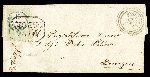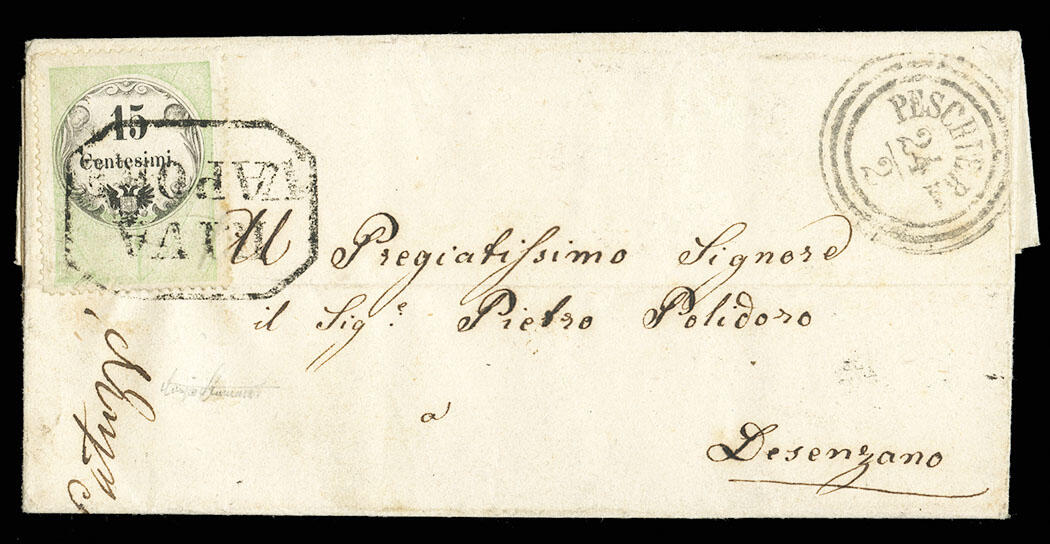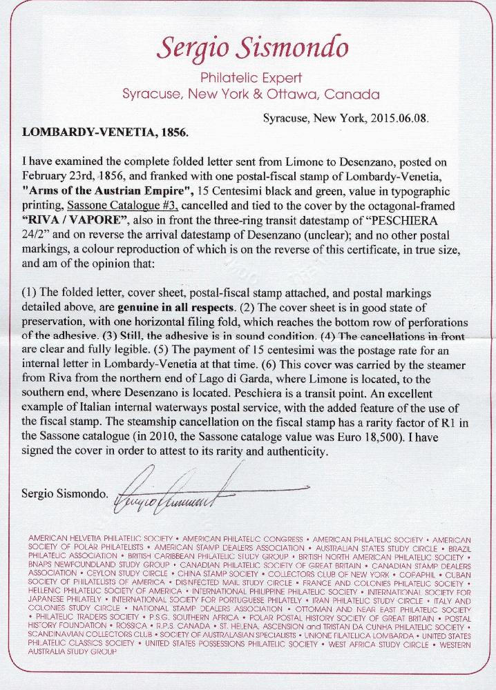 | Zusatzinformationen und Suchstichworte: | Cherrystone - Worldwide Stamps and Covers Auktionstermin: 12. - 14. Juli 2022 Los 235 Österreich Lombardei Venetien 1856 Fiscal stamps used as postage, 15c black & green (typographed) tied by framed two-line "Riva Vapore" departure and "Peschiera 24/2" transit pmk alongside, addressed to Desenzano, with unclear, presumably arrival cancel on back. The payment of 15 centesimi was for the internal postage rate in Lombardy-Venetia at that time. This cover was carried by steamer from Riva (the northern end of Lago di Garda) to the southern end in Desenzano. A fine example of internal waterways postal service, signed Sismondo, with his 2015 certificate, (Catalog value €18,500) Zuschlag 3.000,00 USD |
