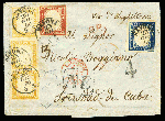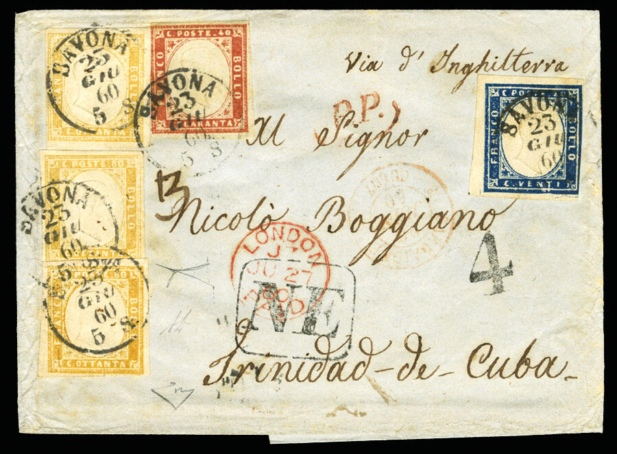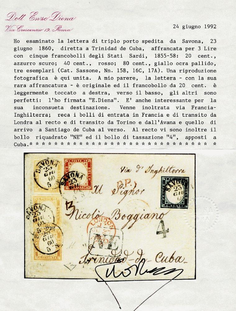 | Zusatzinformationen und Suchstichworte: | Cherrystone - Worldwide Stamps and Covers Auktionstermin: 12. - 14. Juli 2022 Los 998 Italien Staaten Sardinien 1860 folded letter from Savona to Trinidad de Cuba, paying 3 Lire (triple rate) with five stamps including 20c blue, 40c rose and three copies of 80c yellow ochre, tied by Savona 23 June 1860 departure cds, with French entry pmk and London transits in red, also additional Torino and Genova transit pmks on back, taxed "4", with framed "NE" handstamps on front, with Havana arrival (21 July 1860) cds on back. Stamps are mostly with full margins, except 20c just in at right and 40c touching at left, fresh and remarkably well preserved letter from Sardinia to Cuba, uncommon destination, signed Dr.Enzo Diena, with his 1992 certificate Zuschlag 3.000,00 USD |