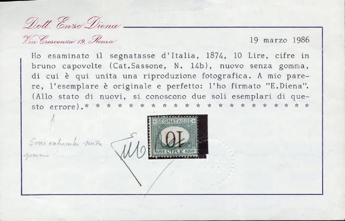 | Zusatzinformationen und Suchstichworte: | Cherrystone - Worldwide Stamps and Covers Auktionstermin: 12. - 14. Juli 2022 Los 1025 Italien 1874 10L blue & magenta, numerals inverted, usual centering, unused without gum, fresh and fine, with 1986 Dr.Enzo Diena and 2000 Silvano Sorani certificates. One of only three (!) known unused examples of this error (all without gum). A world-class rarity! (Sass.14b) (Catalog value €25,000) Zuschlag 9.500,00 USD |
