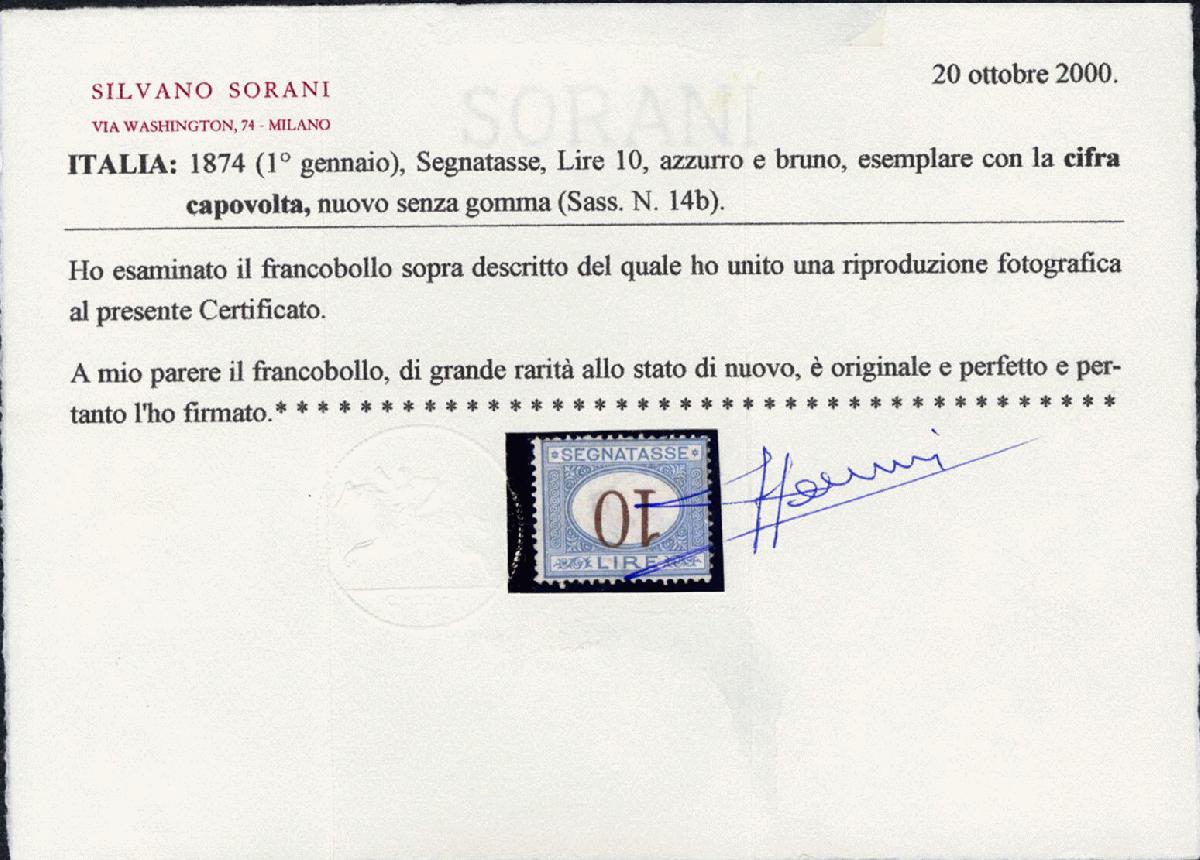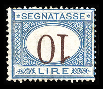 | Zusatzinformationen und Suchstichworte: | Cherrystone - Worldwide Stamps and Covers Auktionstermin: 12. - 14. Juli 2022 Los 1025 Italien 1874 10L blue & magenta, numerals inverted, usual centering, unused without gum, fresh and fine, with 1986 Dr.Enzo Diena and 2000 Silvano Sorani certificates. One of only three (!) known unused examples of this error (all without gum). A world-class rarity! (Sass.14b) (Catalog value €25,000) Zuschlag 9.500,00 USD |