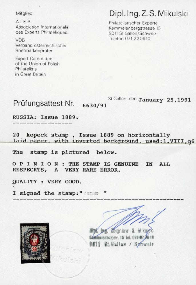 | Zusatzinformationen und Suchstichworte: | Cherrystone - Worldwide Stamps and Covers Auktionstermin: 12. - 14. Juli 2022 Los 1304 Russland 1889 20k blue & carmine, groundwork inverted, canceled 1.VIII.96, well centered, v.f. and striking error, with Mikulski certificate. A rarity, only a few known to exist (listed but unpriced) Ausruf 14.000,00 USD |