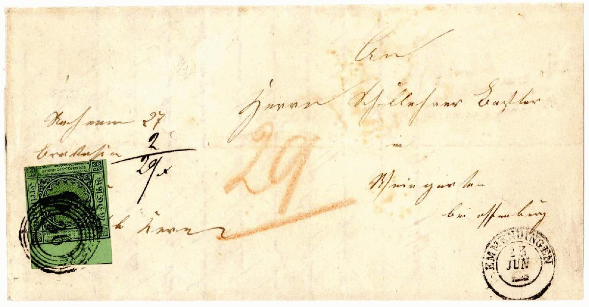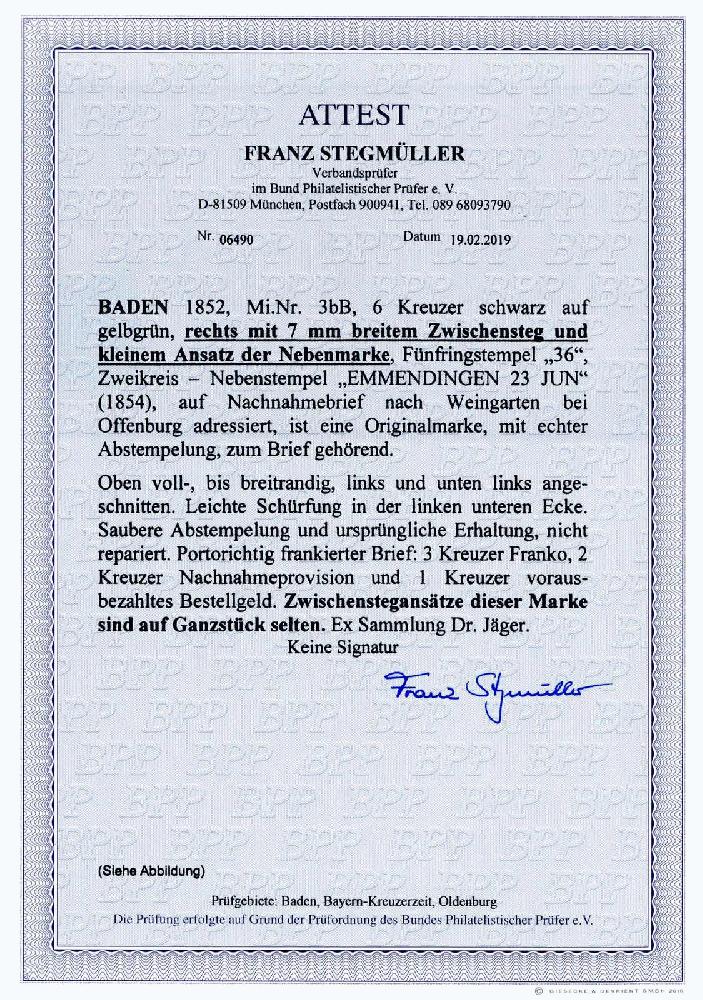 | Zusatzinformationen und Suchstichworte: | 229. Karl Pfankuch & Co Auktion Auktionstermin: 10. - 11. August 2022 Los 11 Altdeutschland Baden 6 Kr. schwarz/gelbgrün, teils vollrandig, links unten minimale Randschürfung, rechts mit 7mm breitem Zwischensteg und Ansatz der Nebenmarke, auf Nachnahmebrief mit NS "36" und K2 "EMMENDINGEN" 1854. Es sind vier Briefe mit Brückenansätzen (und zwei vollständige Brücken auf Brief) von dieser Marke registriert, davon das vorliegende Stück von der 134. Köhler-Auktion, Fotoattest Stegmüller, M€ 3.500,- Ausruf 1.600,00 EUR |