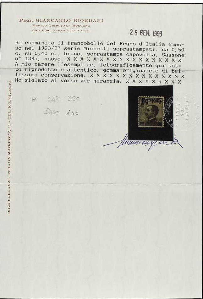 | Zusatzinformationen und Suchstichworte: | Soler y Llach - 777. Auktion - Stamps and Covers of the World Auktionstermin: 19. Juli 2022 Los 1024 Italien ITALIA. 50 cts. s. 40 cts. castaño SOBRECARGA INVERTIDA. Cert. GIORDANI. Sa.139a. Sassone.650€ Ausruf 50,00 EUR |