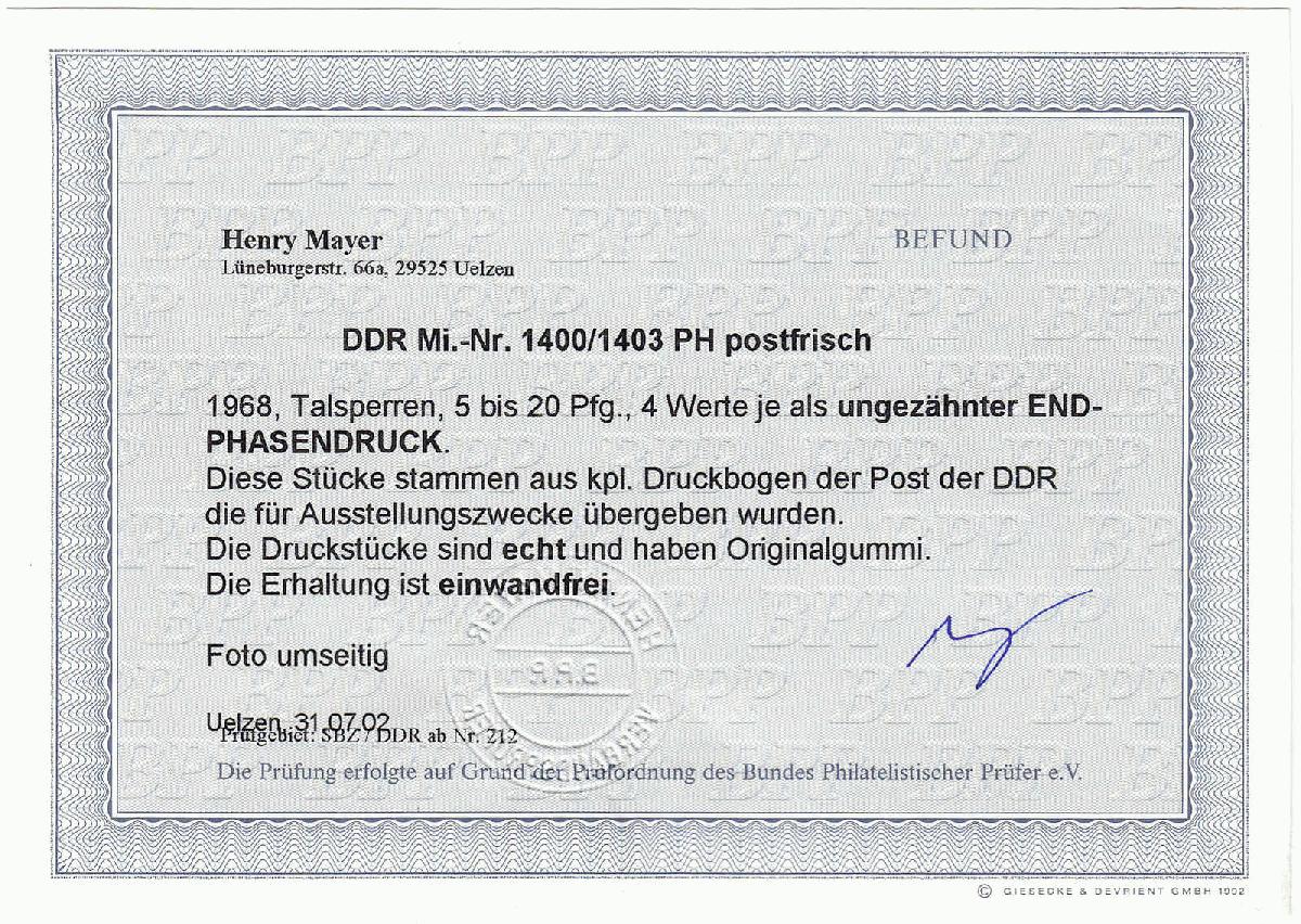 | Zusatzinformationen und Suchstichworte: | 140. & 141. Teutoburger Münzauktion Auktionstermin: 6. - 10. Dezember 2021 Los 4235 DDR Nach 1945 erbaute Talsperren 1968, kompletter Satz ungezähnter END-PHASENDRUCKE in postfrischer Luxuserhaltung. Fotobefund Mayer BPP >einwandfrei<. Ausruf 45,00 EUR |