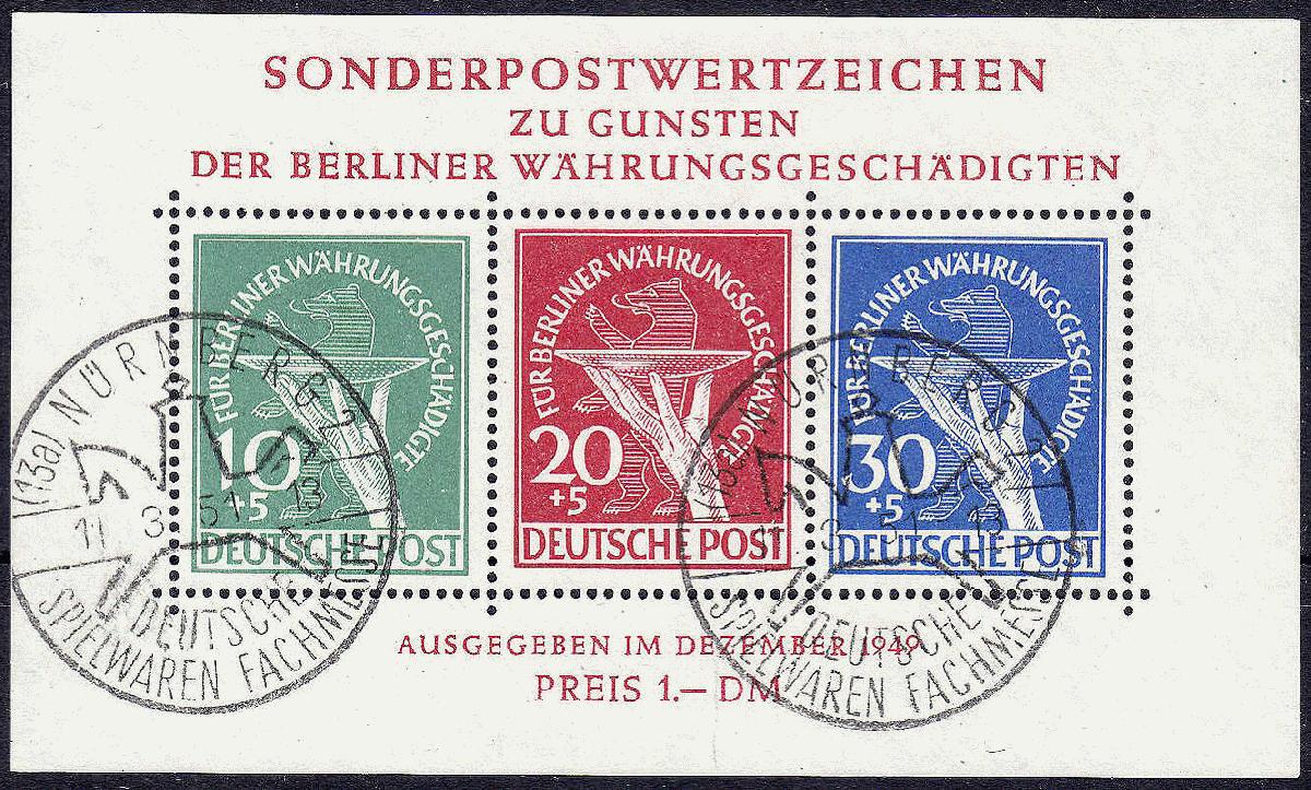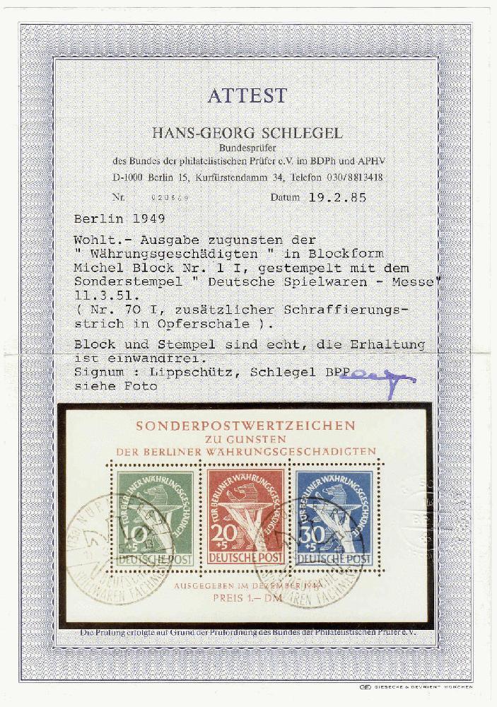 | Zusatzinformationen und Suchstichworte: | 140. & 141. Teutoburger Münzauktion Auktionstermin: 6. - 10. Dezember 2021 Los 4312 BerlinWährungsgeschädigten-Block 1949, gestempelt mit Sonderstempel ,,Deutsche Spielwaren-Messe 11.3.51", Plattenfehler ,,II" (Bruch im ,,C" in Währungsgeschädigte und Schraffierungsstrich in Opferschale). Fotoattest Schlegel BPP. Mi. 3.500,-€. gestempelt Ausruf 540,00 EUR |