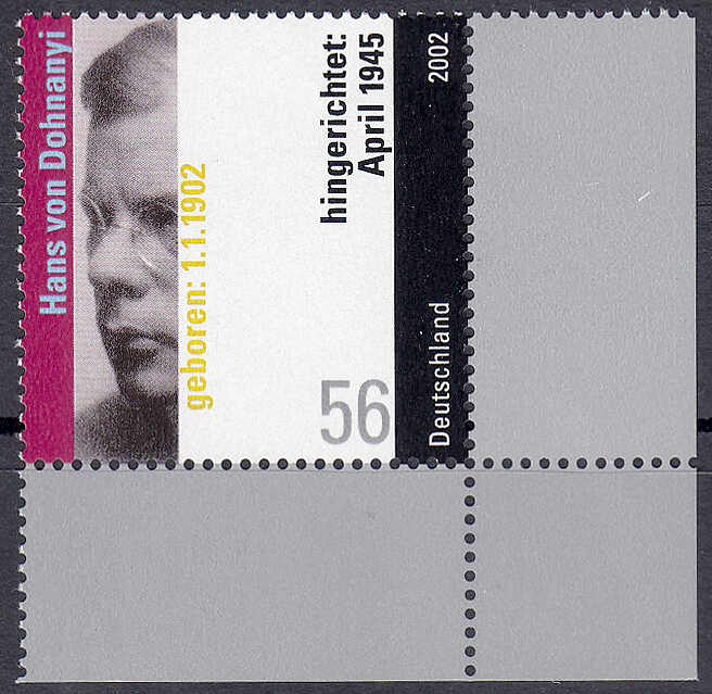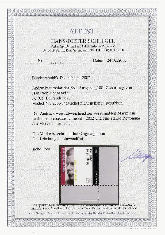 | Zusatzinformationen und Suchstichworte: | 140. & 141. Teutoburger Münzauktion Auktionstermin: 6. - 10. Dezember 2021 Los 4434 Bundesrepublik Deutschland 100. Geburtstag von Hans von Dohnanyi 2002, postfrische Luxuserhaltung, rechte untere Bogenecke, Probedruck (Porträt mit rötlich hinterlegtem Hintergrund, Jahreszahl „2002“ oben rechts). Fotoattest Schlegel BPP >Die Erhaltung ist einwandfrei<. Zuschlag 110,00 EUR |