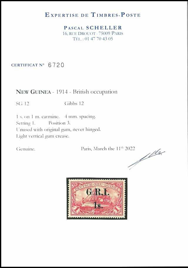 | Zusatzinformationen und Suchstichworte: | Dr. Reinhard Fischer 186. Auktion Auktionstermin: 18. - 21. Mai 2022 Los 2471 Deutsche Kolonien Neuguinea Britische Besetzung 1 s. GRI auf 1 Mark Kaiseryacht, 1st. Setting Pos. 3, postfrisch mit minimalem Gummibug (unbedeutend), tadellose Erhaltung, Auflage für beide Aufdrucktypen zusammen nur 128 Exemplare, Attest Eichele und Certificat Scheller (2022): "Genuine", Mi. 2.500.-++ (ohne Berücksichtigung des seltenen 1st Seetings.) Zuschlag 2.400,00 EUR |