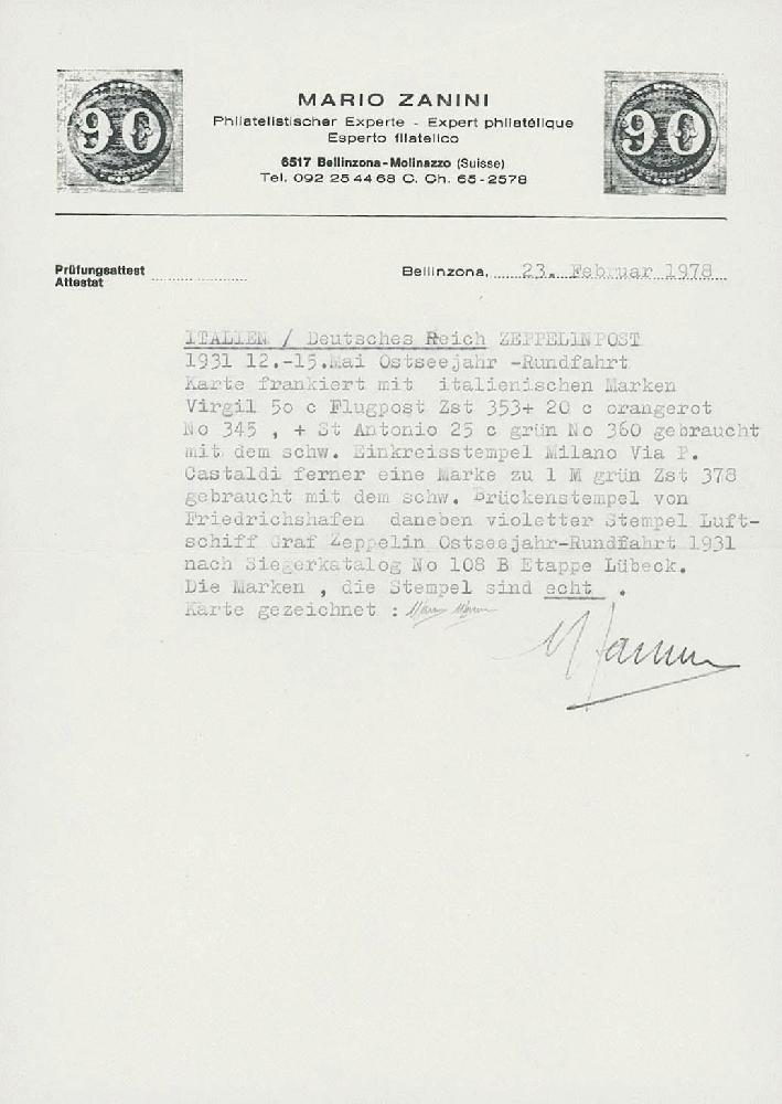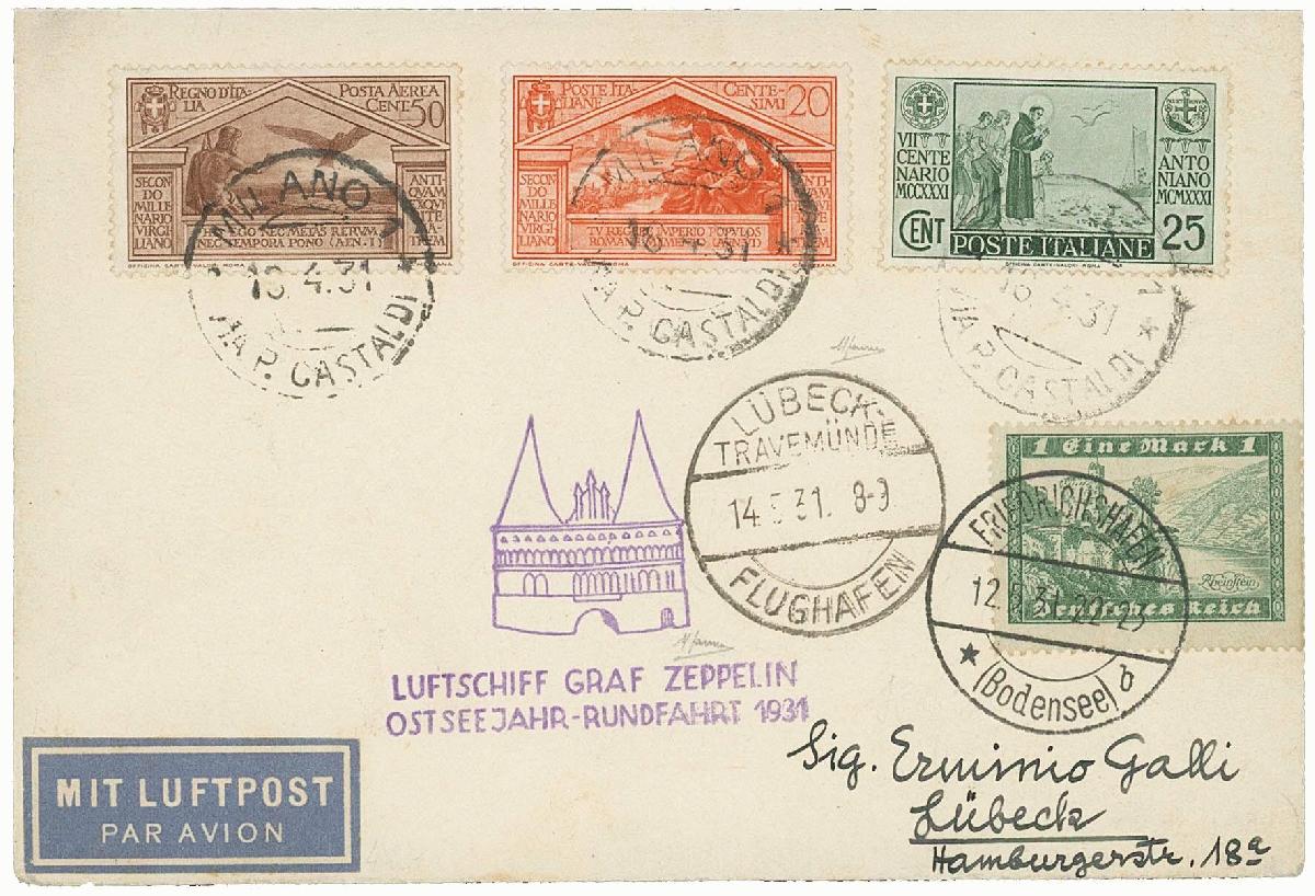 | Zusatzinformationen und Suchstichworte: | Ulrich Felzmann 175. Auktion Auktionstermin: 30. Juni 2022 Los 3131 Italien Ostseejahr-Rundfahrt 1931, Etappe bis Lübeck, Karte ab Mailand 16.4. mit 20, 25 und 50 C Sondermarken in bunter MiF, als reguläre Post bis Friedrichshafen, Transit 12.5. und weiter als deutsche Post in Zweiländer-MiF mit 1 Mk Rheinstein, Flugstempel und Ankunft Lübeck 14.5. vs., frühe Zuleitung, sehr selten, Pracht, Longhi "... sehr wenige Belege befördert" (Longhi 63 - ca. 8.000 €) Zuschlag 5.600,00 EUR |