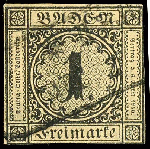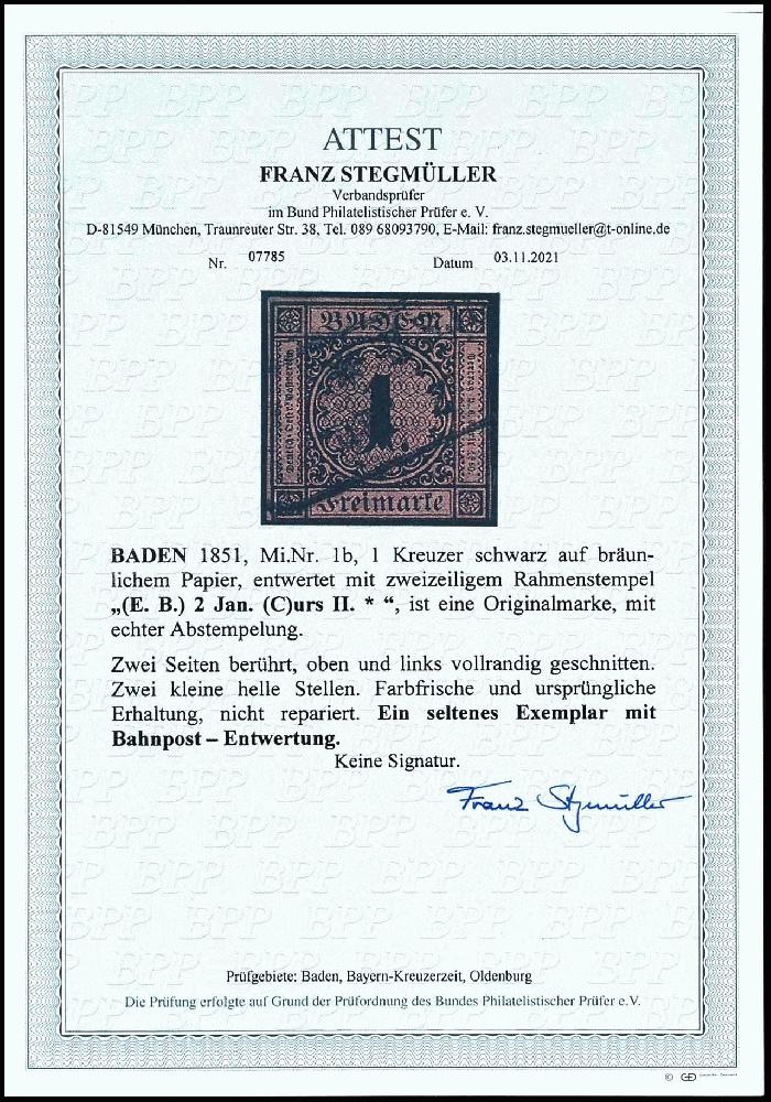 | Zusatzinformationen und Suchstichworte: | Dr. Reinhard Fischer 186. Auktion Auktionstermin: 18. - 21. Mai 2022 Los 1349 Altdeutschland Baden 1 Kreuzer schwarz auf bräunlich, entwertet mit zweizeiligem Rahmenstempel "(E. B.) 2 Jan. (C)urs II. *", Fotoattest Stegmüller BPP (2021): "Zwei Seiten berührt, oben und links vollrandig geschnitten. Zwei kleine helle Stellen. Farbfrische und ursprüngliche Erhaltung, nicht repariert. Ein seltenes Exemplar mit Bahnpost-Entwertung." Ausruf 300,00 EUR |