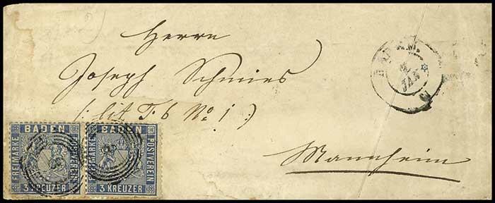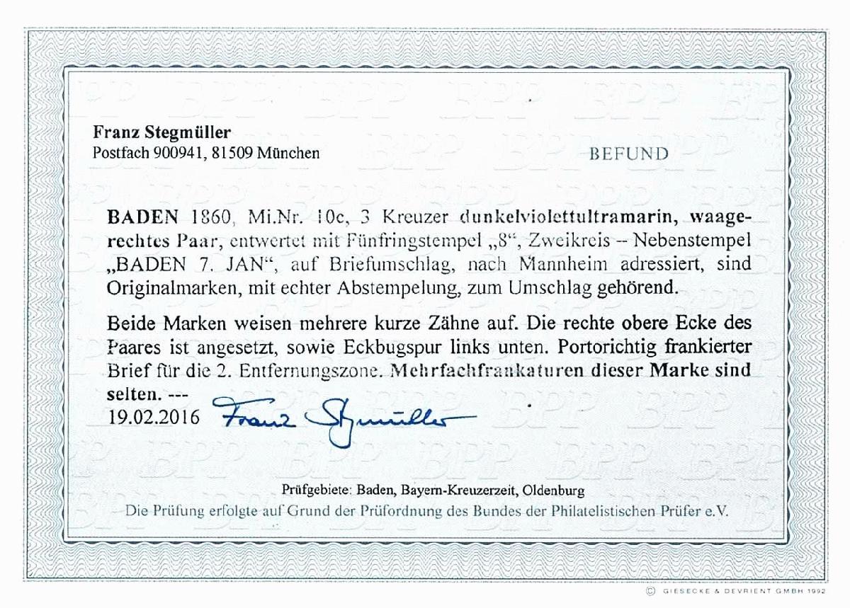 | Zusatzinformationen und Suchstichworte: | Dr. Reinhard Fischer 186. Auktion Auktionstermin: 18. - 21. Mai 2022 Los 1357 Altdeutschland Baden 3 Kreuzer Wappen veilchenblau, waagerechtes Paar auf portogerechtem Brief von Fünfringstempel "8" mit nebengesetztem K2 "BADEN 7. JAN." nach Mannheim, Zahnfehler, Eckbugspur links unten und die rechte obere Ecke des Paares ausgebessert, der Umschlag mit Altersspuren, Fotobefund Stegmüller BPP (2016) "Mehrfachfrankaturen dieser Marke sind selten.", Mi. 1.100.- Ausruf 100,00 EUR |