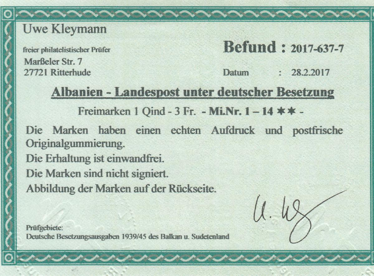 | Prüfgebiet: | Deutsche Besetzung WK 2 Albanien Landespost |