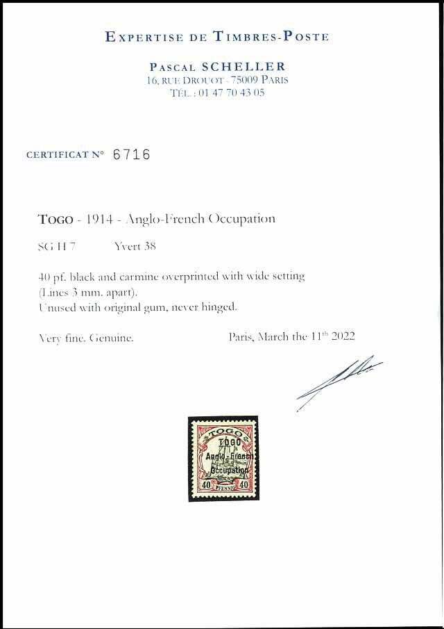 | Zusatzinformationen und Suchstichworte: | Dr. Reinhard Fischer 186. Auktion Auktionstermin: 18. - 21. Mai 2022 Los 2724 Deutsche Kolonien Togo Britische Besetzung 40 Pfg Kaiseryacht mit dreizeiligem Bdr.-Aufdruck, Zeilenabstand 3 mm, tadellos postfrisch, Auflage nur 550 Exemplare, unsigniert, Attest Eichele und Certificat Scheller (2022): "Very fine. Genuine", Mi. 800.- Ausruf 250,00 EUR |