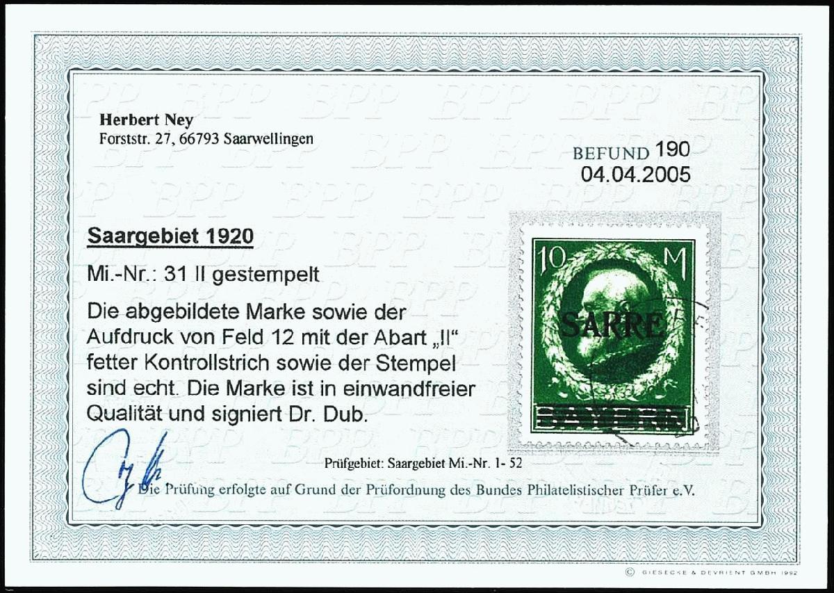 | Prüfgebiet: | Saargebiet (Mi-Nr. 1 - 205) |
