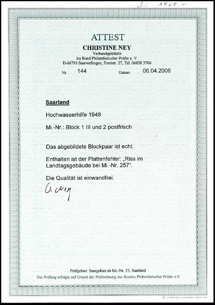 | Zusatzinformationen und Suchstichworte: | Dr. Reinhard Fischer 186. Auktion Auktionstermin: 18. - 21. Mai 2022 Los 3023 Saargebiet Blockausgabe "Hochwasserhilfe", Blockpaar, postfrisch, tadellose Erhaltung, Fotoattest Ney BPP, Mi. 1.700,- Ausruf 450,00 EUR |