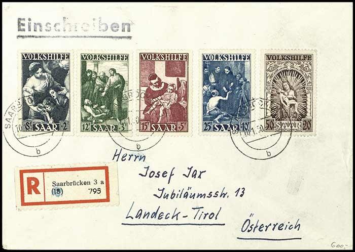 | Zusatzinformationen und Suchstichworte: | Dr. Reinhard Fischer 186. Auktion Auktionstermin: 18. - 21. Mai 2022 Los 3030 Saar 8 Fr. bis 50 Fr. Volkshilfe 1949, kpl. Satz auf R-Brief mit Entwertung "SAARBRÜCKEN 3b 10.1.50" nach Landeck in Tirol (Österreich), Fotoattest Ney VP (2017): "Der Satz auf dem befördertem Brief ist in einwandfreier Erhaltung.", Mi. für lose 650.- Ausruf 150,00 EUR |