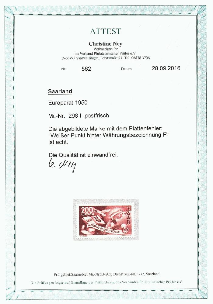 | Zusatzinformationen und Suchstichworte: | Dr. Reinhard Fischer 186. Auktion Auktionstermin: 18. - 21. Mai 2022 Los 3040 Saar 200 Fr. Europarat, Plattenfehler I "weißer Punkt hinter F der Wertbezeichnung", tadellos postfrisch, Fotoattest Ney VP (2016): "Die Qualität ist einwandfrei.", Mi. 600.- Zuschlag 130,00 EUR |