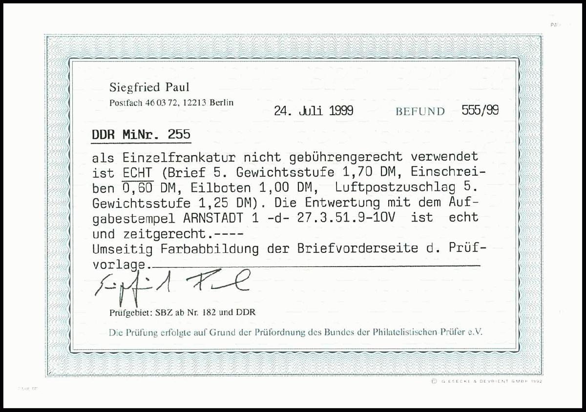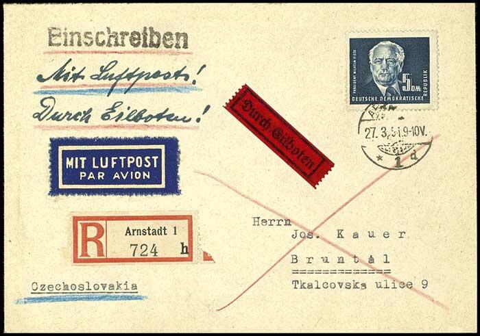 | Zusatzinformationen und Suchstichworte: | Dr. Reinhard Fischer 186. Auktion Auktionstermin: 18. - 21. Mai 2022 Los 3763 DDR 5 Mark Pieck, Einzelfrankatur auf überfrankiertem Auslands-R-Eilboten-Luftpostbrief der 5 Gewichtsstufe, entwertet "Arnstadt 1-d- 27.3.51 9-10V", Fotobefund Paul BPP Ausruf 40,00 EUR |