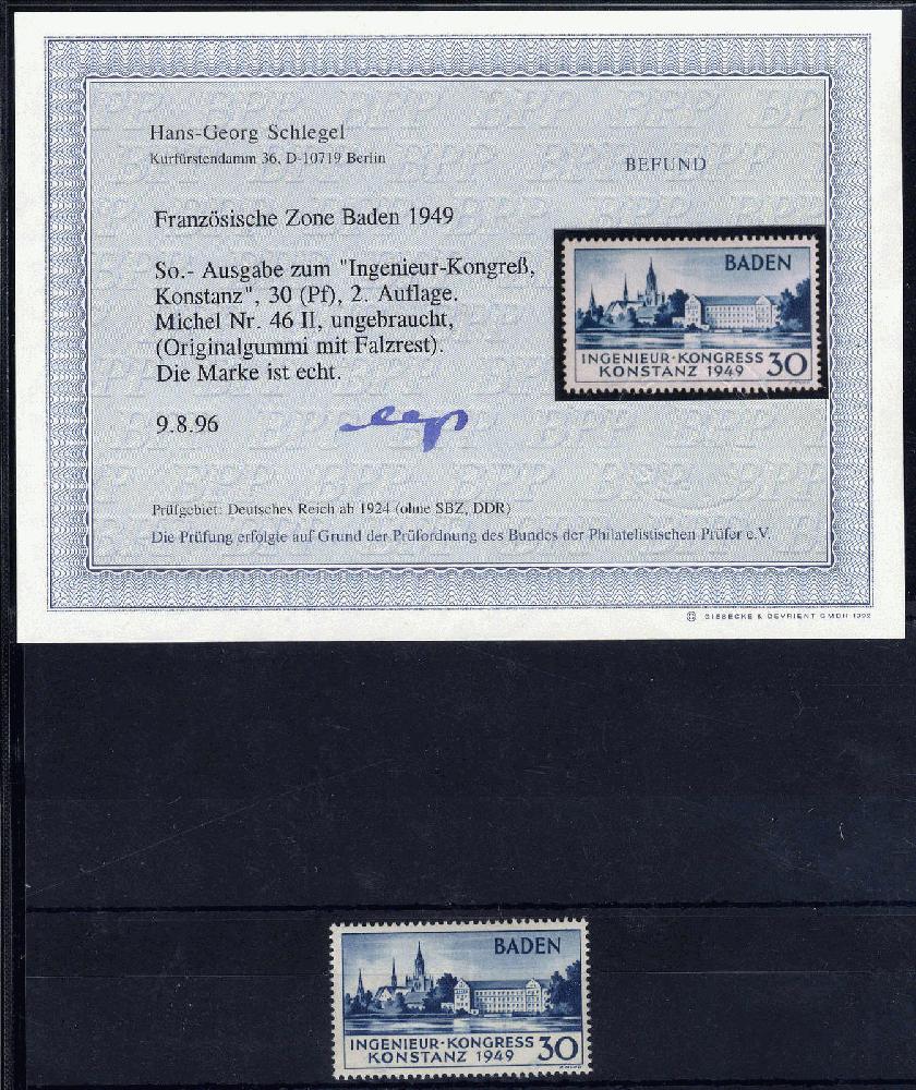 | Zusatzinformationen und Suchstichworte: | Veuskens Sonderpreisliste Sommer 2022 Los 0001203731 Französische Zone Baden Ingenieur-Kongress 1949, in seltener Type II., sauber ungebraucht, mit Farbfotobefund Schlegel BPP, Kabinett. M€ 340,-- Alter Preis: 94,50 EUR Festpreis 70,90 EUR |