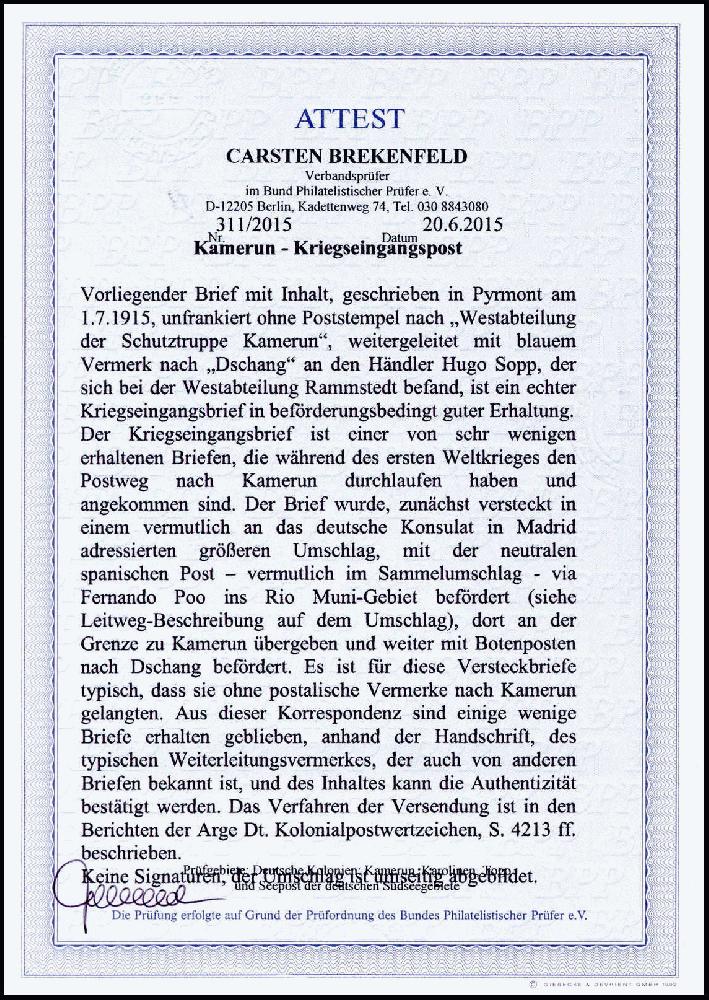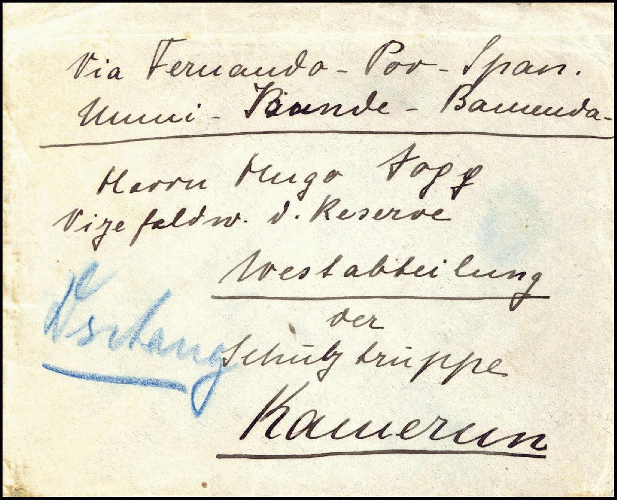 | Zusatzinformationen und Suchstichworte: | Württembergisches Auktionshaus 141. Versteigerung 10. Dezember 2022 Los 6466 Deutsche Kolonien Kamerun Kriegspost Eingangspost Herbst 1915: "Pyrmont 1/7 15", kpl. Brief mit datiertem Inhalt, ohne Poststempel, adressiert an die "Westabteilung der Schutztruppe Kamerun", oben mit Leitvermerk "via Fernando Poo, Span. Muni - Kunde - Bamenda". Dieser Brief wurde offensichtlich in einem Sammelumschlag zunächst an das Deutsche Konsulat in Madrid gesandt und ging von dort mit der neutralen Spanischen Post, vermutlich ebenfalls im Sammelumschlag "via Fernando Poo" ins Rio-Muni-Gebiet. Dort wurde er als sog. "Schmuggelpost" an der Grenze zu Kamerun einem Boten übergeben, welcher ihn gemäß blauem Zustellvermerk nach Dschang beförderte. Eingangspost nach Kamerun während des Weltkrieges ist extrem selten. Der hier gezeigte Brief aus 1915 mit seinem kompletten Inhalt und dem geschilderten Laufweg stellt eine spektakuläre postgeschichtliche Rarität dar (vgl. auch AG-Berichte S.4213 ff), ausführl. Attest Brekenfeld BPP. Ausruf 2.500,00 EUR |