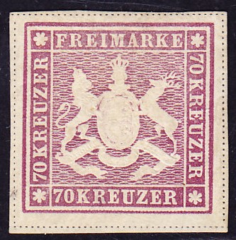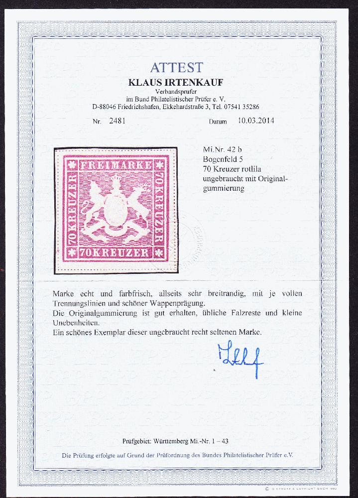 | Zusatzinformationen und Suchstichworte: | Weggler Shop Los 0000100059 Altdeutschland Württemberg 1873 70 Kreuzer rotlila, ungebraucht mit Originalgummi, farbfrisch breitrandig. Attest: K. Irtenkauf. Festpreis 1.000,00 CHF |