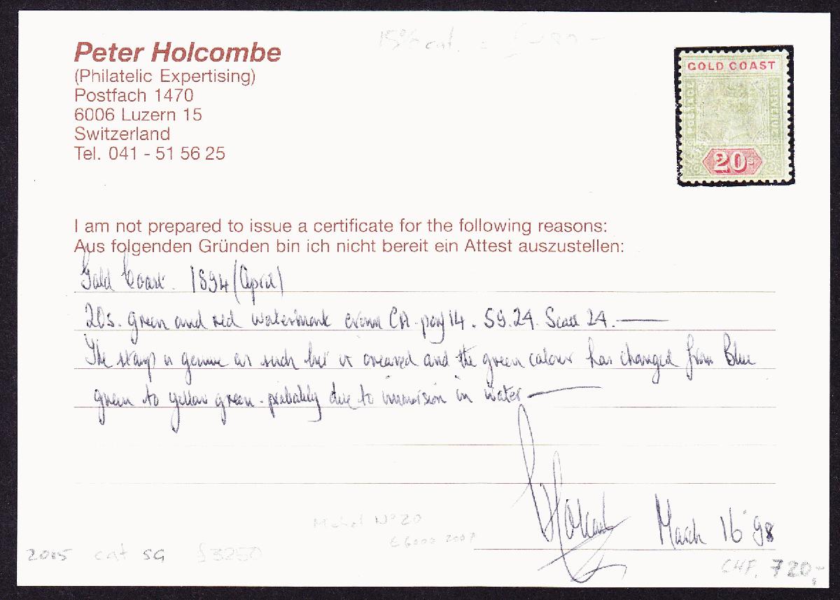 | Zusatzinformationen und Suchstichworte: | Weggler Shop Los 0000100006 Goldküste 1894 20s verblaste Farbe. Laut Attest durch Wasser oder Benzin Einfluss. Festpreis 650,00 CHF |