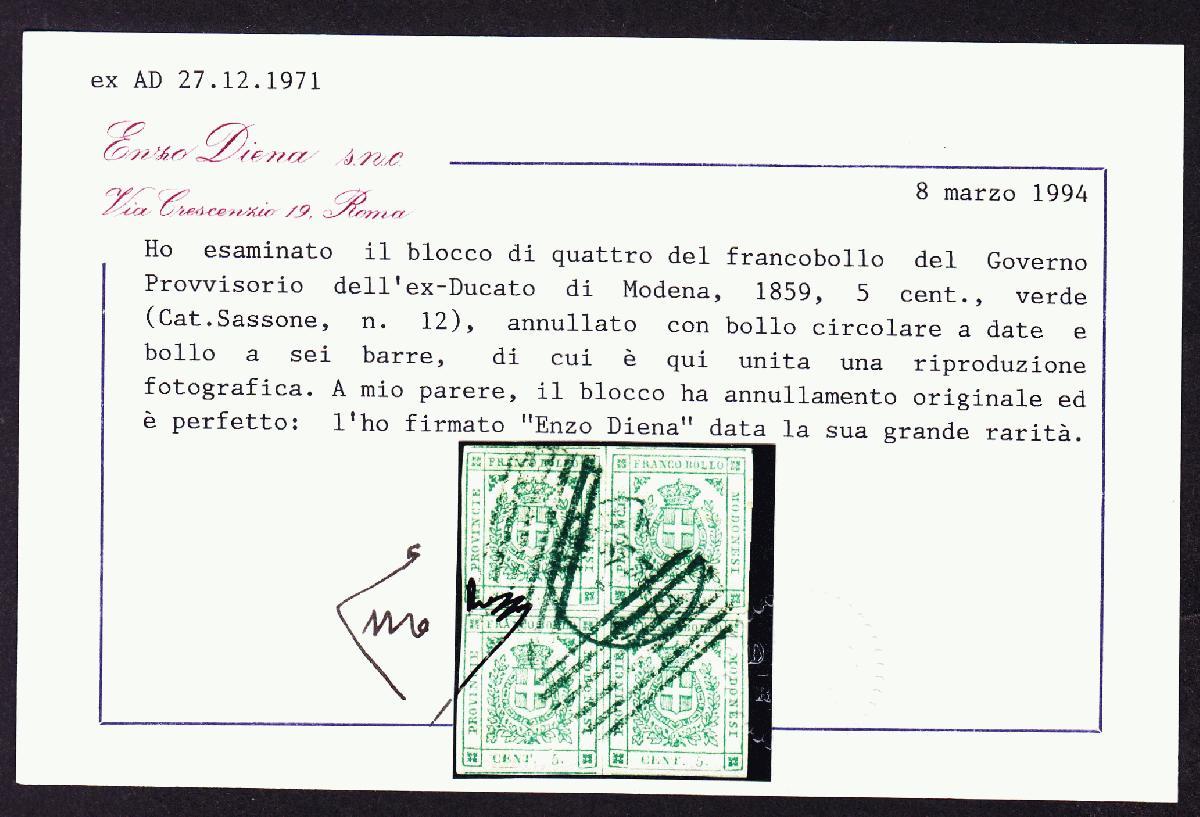 | Zusatzinformationen und Suchstichworte: | Weggler Shop Los 0000100054 Italien Staaten Modena 1859 Modena Provisorische Regierung 5c grün, gestempelter 4er Block. Vollrandig. Fehlerfrei. Atteste E. Diena und G. Colla. Katalog Sassone 2015: 80000 EURO Ausruf 7.900,00 CH |