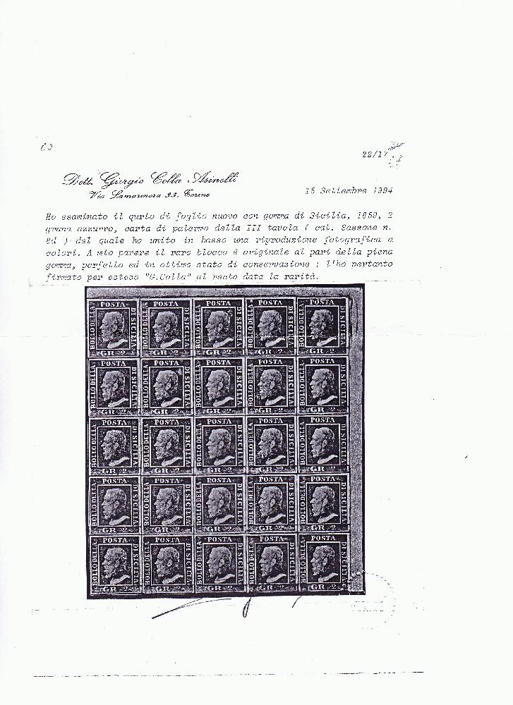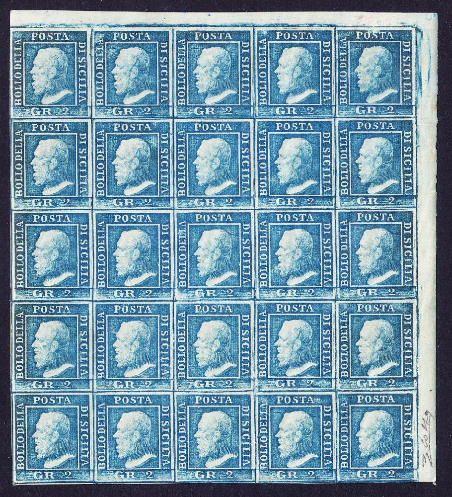 | Zusatzinformationen und Suchstichworte: | Weggler Shop Los 0000100025 Italien Staaten Sizilien 1859 2 Grana blau III Tafel. Bogenecke, 25 Marken mit Originalgummi, signiert und attestiert Dr. G. Colla. Festpreis 6.000,00 CHF |