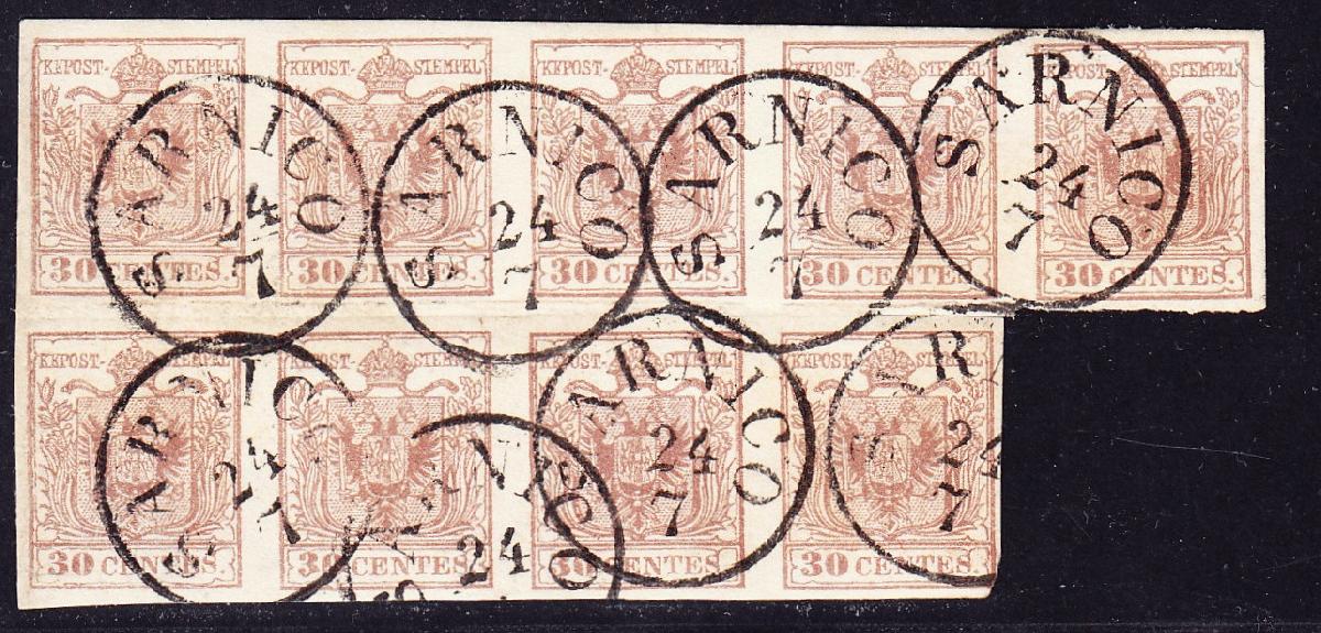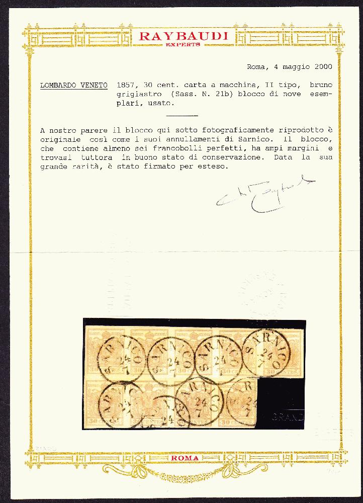 | Zusatzinformationen und Suchstichworte: | Weggler Shop Los 0000100056 Österreich Lombardei Venetien 1857 30c braun Type II. 9er Block mit sauberen Stempel Sarnico. Attest Raybaudi: Vollrandig und fehlerfrei, signiert. Festpreis 7.900,00 CHF |