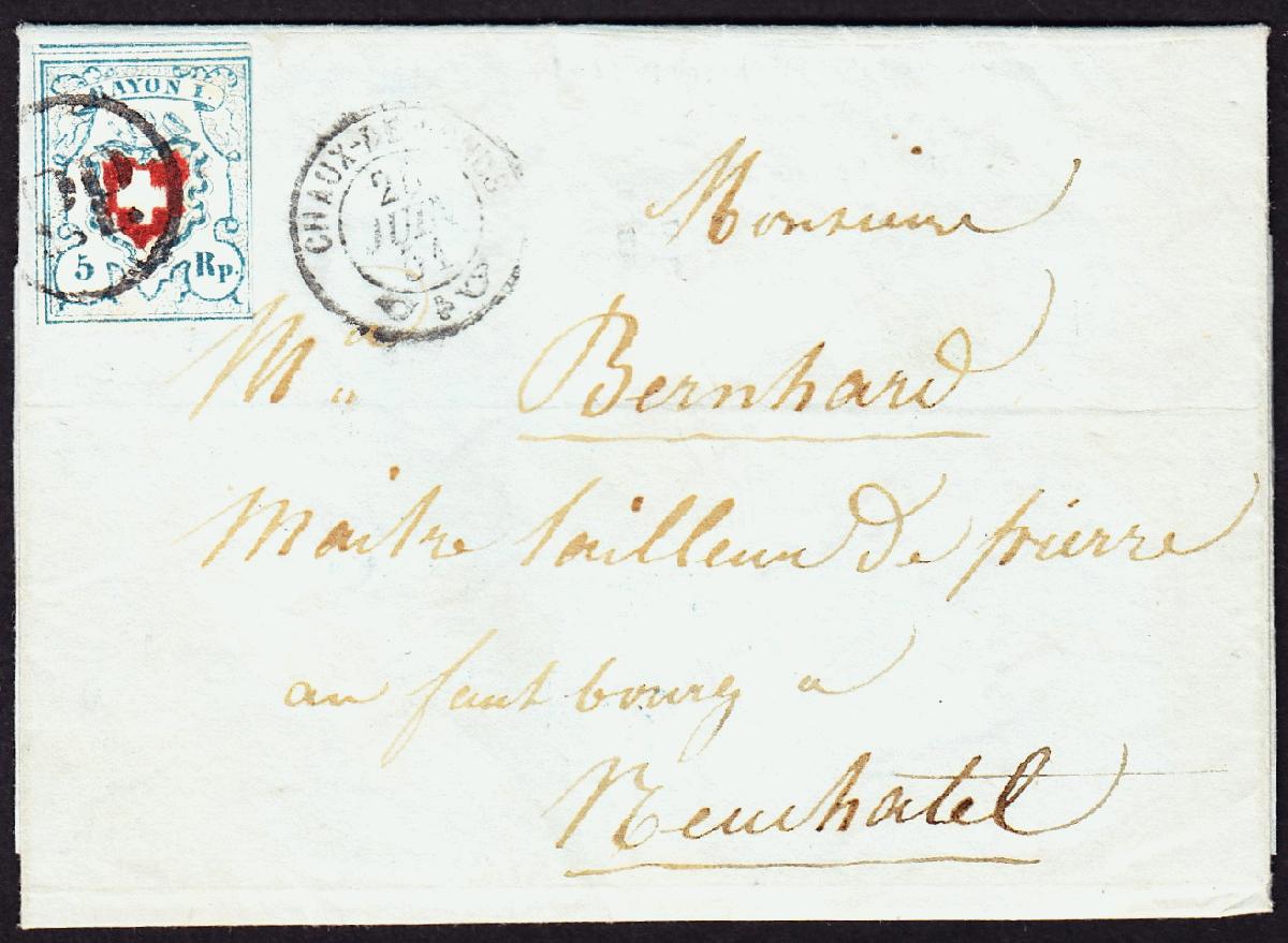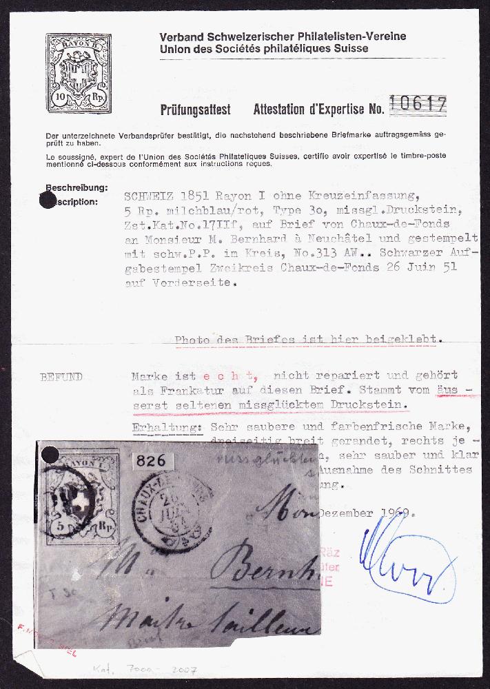 | Zusatzinformationen und Suchstichworte: | Weggler Shop Los 0000100052 Rayon I, hellblau, ohne KE (STEIN M) 1851 Rayon I hellblau, Type 30, Missglückter Druckstein mit PP Stempel im Kreis auf Faltbrief aus Chaux de Fonds nach Neuchâtel. Attest Moser. 3 seitig vollrandig, rechts leicht beschnitten. Festpreis 4.000,00 CHF |