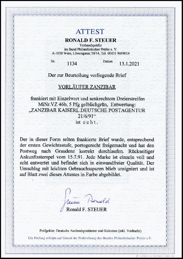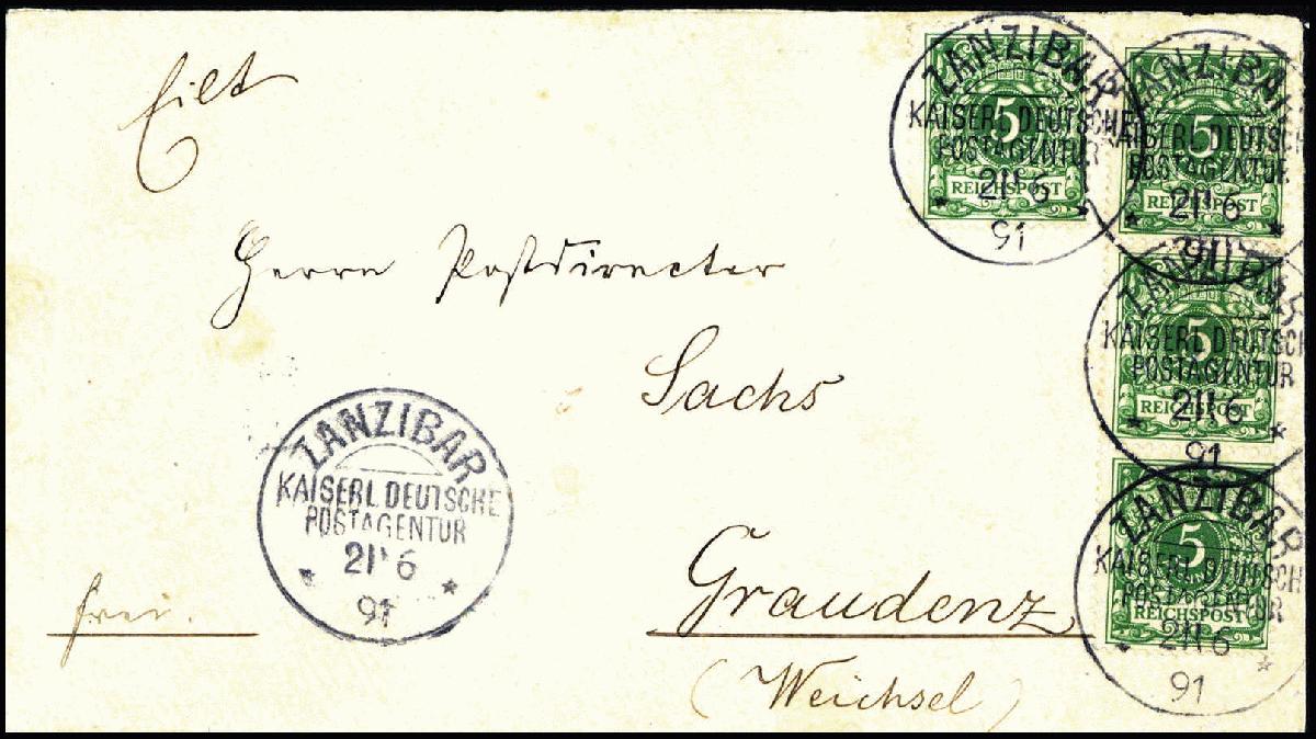 | Zusatzinformationen und Suchstichworte: | Württembergisches Auktionshaus 140. Versteigerung Auktionstermin: 18. Juni 2022 Los 6123 Deutsche Kolonien Ostafrika, Vorläufer Sansibar 5 Pfg., senkr. Dreierstreifen und Einzelstück als tadellose, erstklassig frisch erhaltene 20-Pfg.-Frankatur auf schönem, weißem Kuvert nach Graudenz, fünf ideale Stempel ZANZIBAR KDPA 21/6 91, rs. Eingangsstempel vom 15.7.91. Einer der ebenso seltenen wie postgeschichtlich interessanten Briefe, bei denen viermal die 5-Pfg.-Wertstufe anstatt einer 20-Pfg.-Marke verklebt wurde, Fotoattest Steuer BPP. Ausruf 2.500,00 EUR |