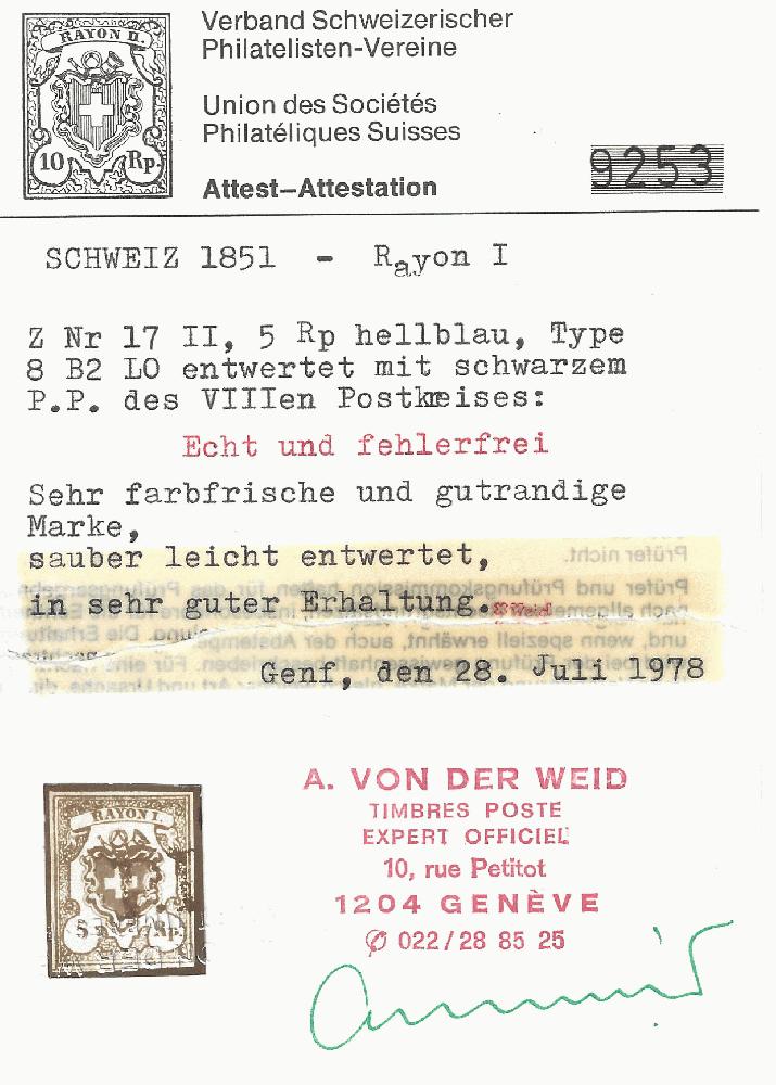 | Prüfer: | von der Weid, Alain (SBPV / ASEP (Schweizerischer Briefmarken-Prüfer-Verband)) |