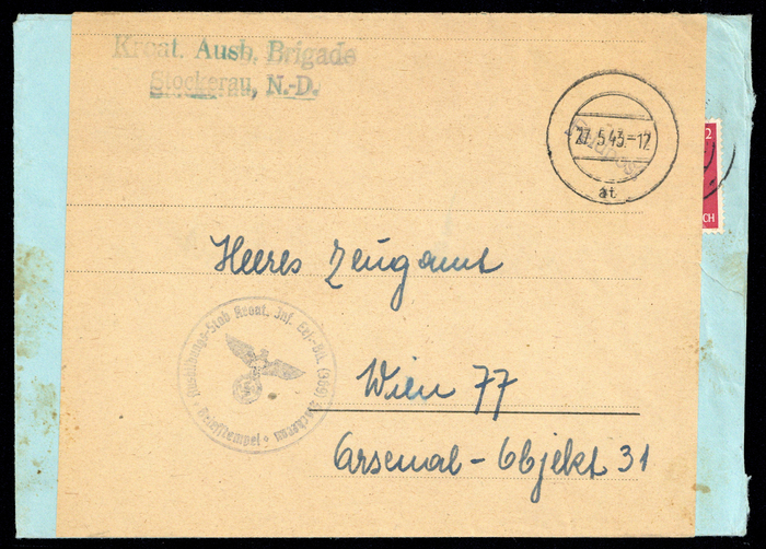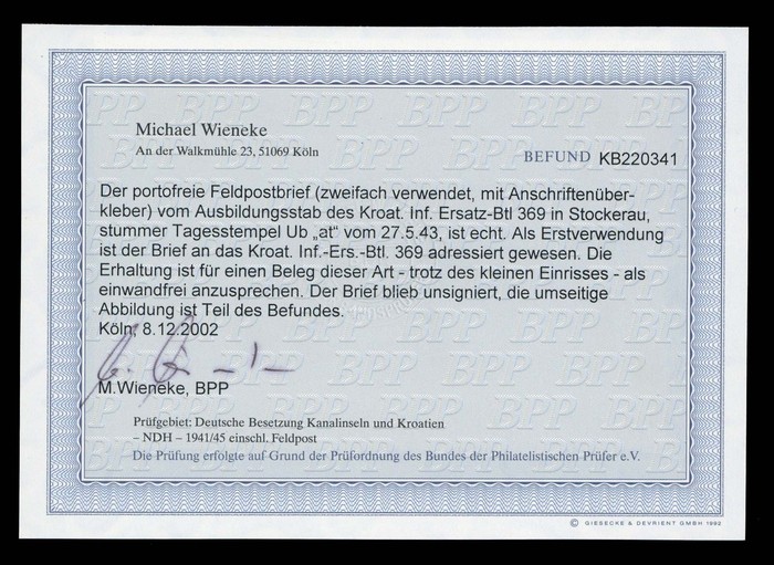 | Zusatzinformationen und Suchstichworte: | DBA Freiburg GmbH Los 1330200305 Kroatien 1943, Kroat. Ausbildungseinheiten. Feldpost-Dienstbrief der Kroat. Ausb.-Brigade mit "offenem" Briefstempel und "offener" Absenderangabe. Stummer Stempel mit Ub "at" (Stockerau) vom 27.5.1943 an das Heereszeugamt Wien. Zweifach verwendeter Briefumschlag. Bedarfserhaltung mit kleinem Einriss. Selten. Befund Wieneke BPP. Michel Feldpost-Katalog S. 294, B.2-10e Festpreis 90,00 EUR |