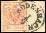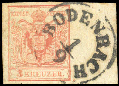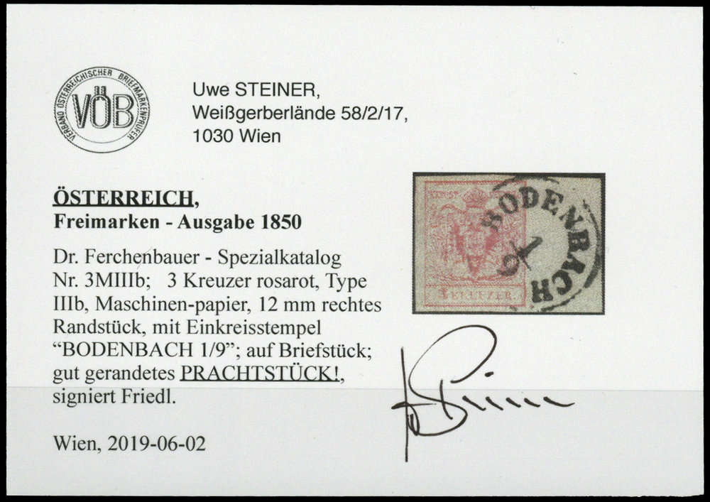 | Zusatzinformationen und Suchstichworte: | DBA Freiburg GmbH Los 1670050765 Österreich 1850, 3 Kr. "rosarot", voll-breitrandig mit rechts 12 mm-Bogenrand und K1 "Bodenbach 1/9", sign. Friedl und Befund Steiner VÖB (Ferchenbauer 3 MIIIb) Festpreis 80,00 EUR |