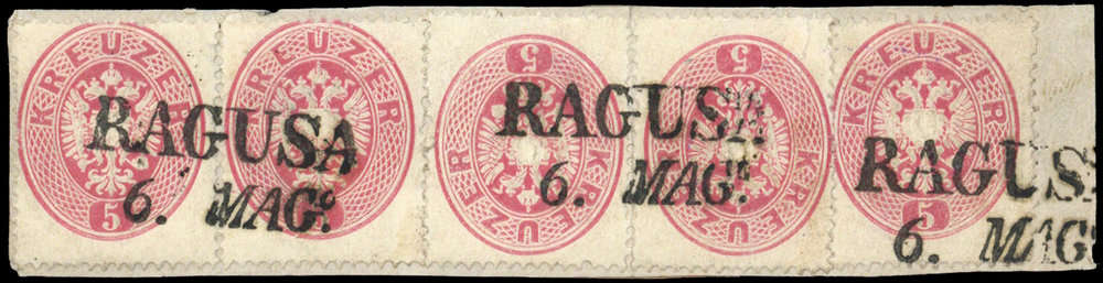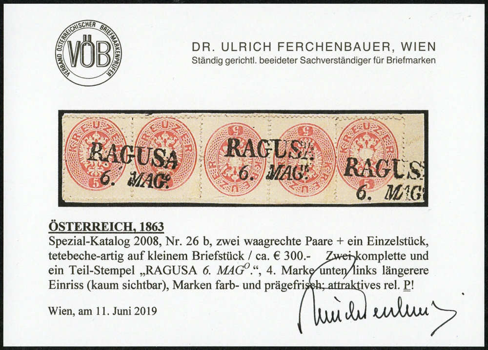 | Zusatzinformationen und Suchstichworte: | DBA Freiburg GmbH Los 1670050778 Österreich 1863, 5 Kr. "karminrosa", zwei waagerechte Paare und Einzelwert teils kopfstehend geklebt auf Briefstück mit 3 x klarem L2 "Ragusa 6. Mago", vierte Marke kaum sichtbarer Einriss, Befund Ferchenbauer VÖB Festpreis 150,00 EUR |