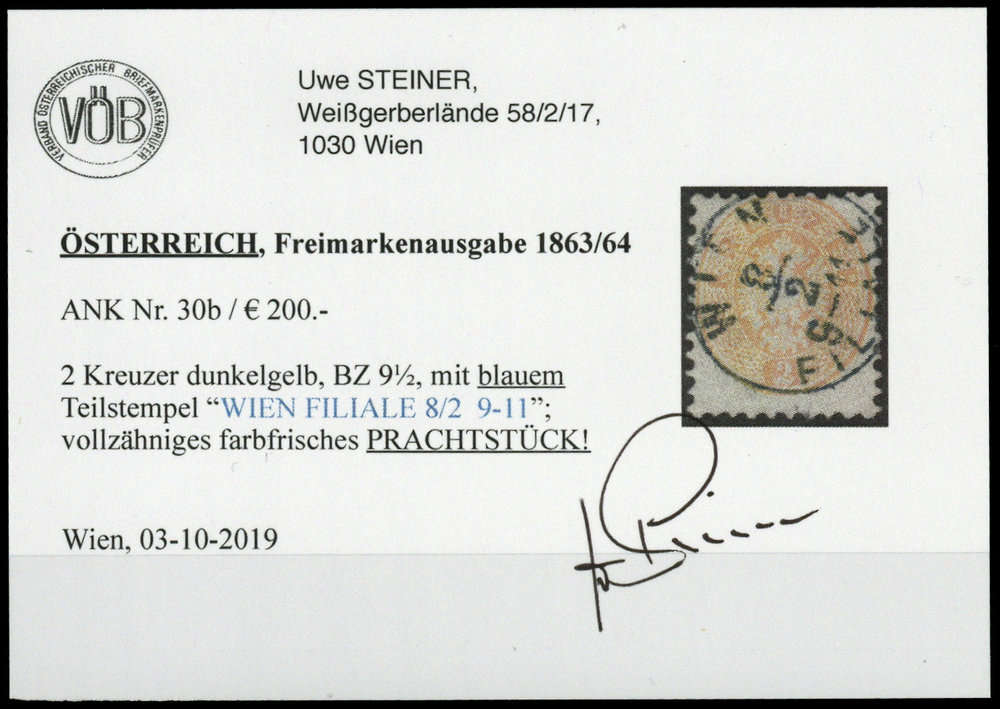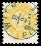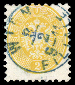 | Zusatzinformationen und Suchstichworte: | DBA Freiburg GmbH Los 1670050754 Österreich 1863, 2 Kr. "dunkelgelb", gestempelt mit blauem K1 "Wien 8/2 9-11 Filiale", Befund Steiner VÖB Festpreis 90,00 EUR |
