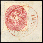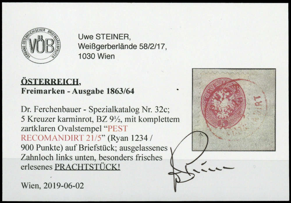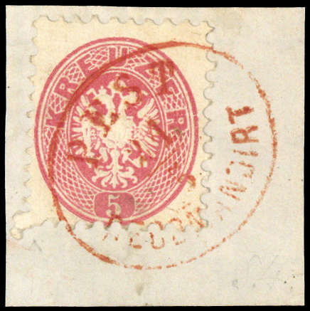 | Zusatzinformationen und Suchstichworte: | DBA Freiburg GmbH Los 1670050758 Österreich 1863, 5 Kr. "karminrot", gestempelt mit rotem Ovalstempel "Pest Recomandirt 21/5" (Ryan 1234, 900 Punkte) auf Briefstück mit Variante "ausgelassenes Zahnloch l.u.", sign. Ferchenbauer und Befund Steiner VÖB Festpreis 230,00 EUR |