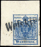 | Zusatzinformationen und Suchstichworte: | DBA Freiburg GmbH Los 1671400515 Österreich 1850, 9 Kr. "tiefdunkelblau", breitrandige Bogenecke l.o. (9:10 mm) mit L1 "Weiskirch(en), Attest Steiner VÖB (Ferchenbauer 5 MIIIb) Festpreis 750,00 EUR |