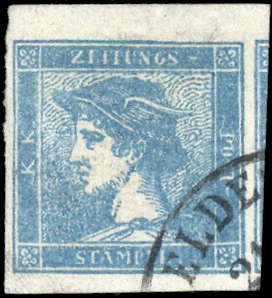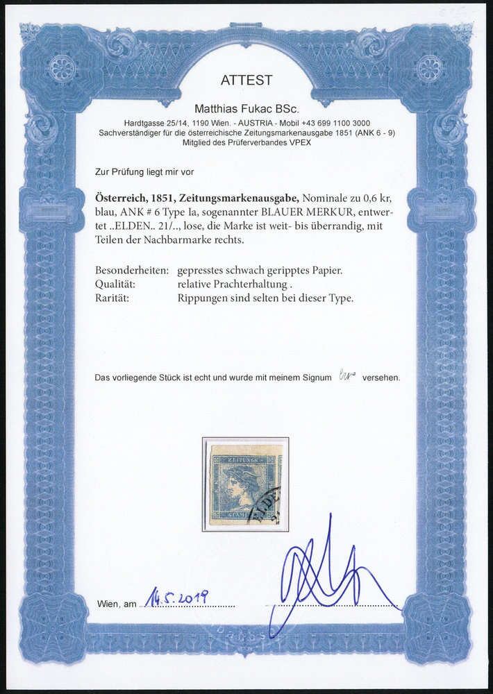 | Zusatzinformationen und Suchstichworte: | DBA Freiburg GmbH Los 1670050747 Österreich 1851, Blauer Merkur, weit-überrandig auf schwach geripptem Papier mit Teilen der Nachbarmarke rechts, gestempelt, Attest Fukac "Rippungen sind selten bei dieser Type" (ANK 6 Ia) Festpreis 300,00 EUR |
