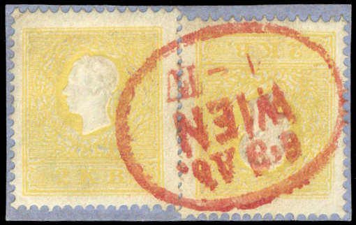 | Zusatzinformationen und Suchstichworte: | DBA Freiburg GmbH Los 1671400512 Österreich 1858. 2 Kr. "gelb", kopfstehend zueinander geklebt auf dekorativem Briefstück mit schönem rotem Ovalstempel "Wien 1-IV 6-8 Ab.", Attest Ferchenbauer VÖB Festpreis 380,00 EUR |